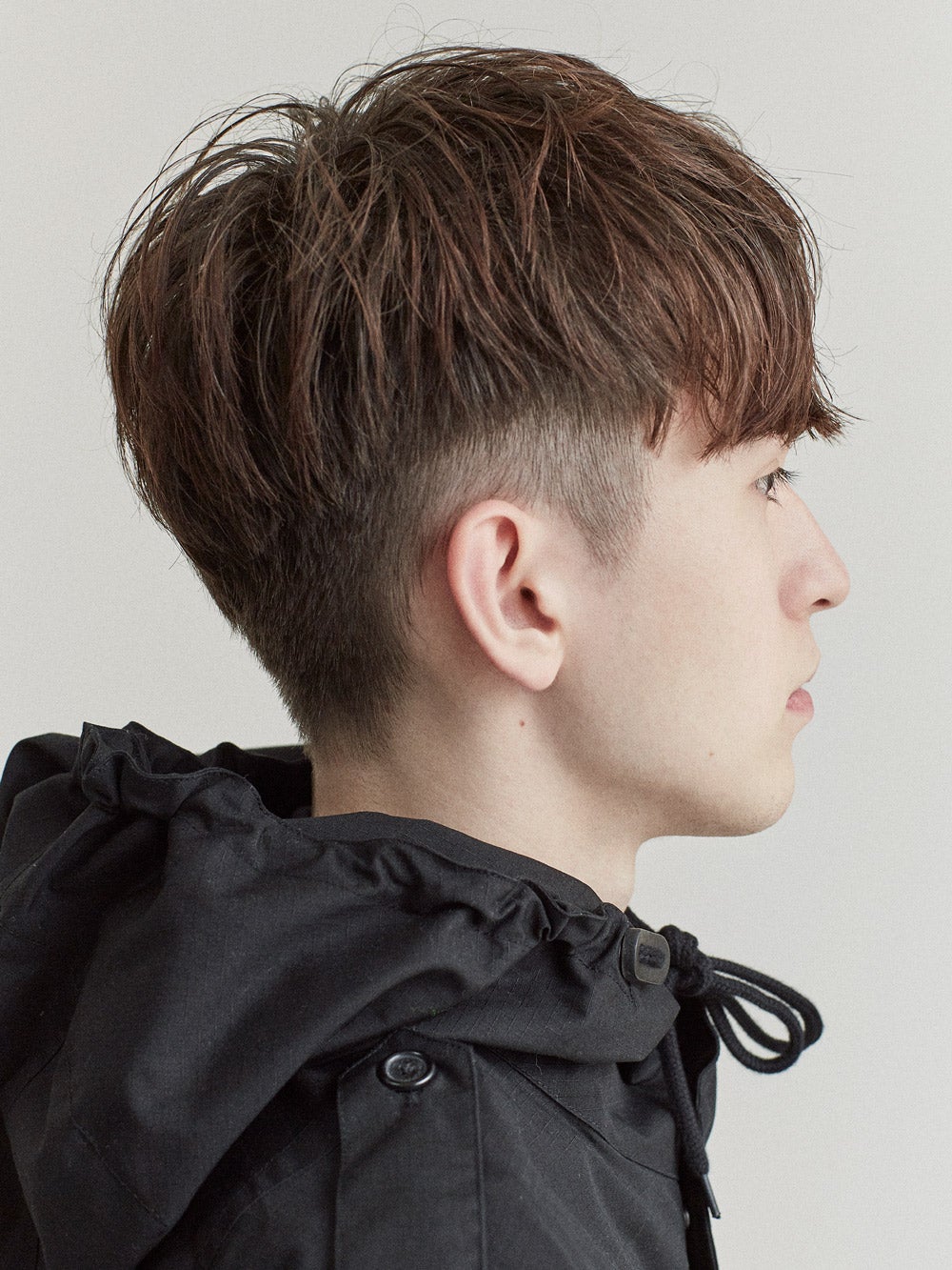 春っぽいニュアンスだけでなく、髪質悩みをカモフラしやすいマッシュショート。春はトップ短めの動きのあるスタイルで、服映え×髪悩み解消を両立させよう。フロントは直線的でラインのあるマッシュに。眉下ギリギリに長さを設定すると大人っぽい。サイドから後頭部はグラデーションカットで自然な丸みを持たせて。そこへ表面トップにレイヤーで短い毛束をプラス。カットラインはベーシックながらやりすぎない“軽さ”が加わり、つぶれやすい髪質はふんわり感がUPし、硬い髪質はやわらかい印象に。