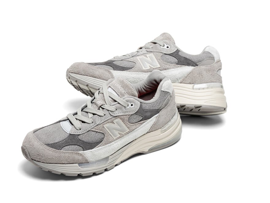 「リーバイスⓇ オーソライズド ビンテージ × ニューバランス 992」は、パッチワークが効いた個性派スニーカー。アッパーには、グレーのヘアリースウェード(毛足の長いスウェード)と、グレーウォッシュデニムをアップサイクルした素材を採用。独特な色彩のコントラストが美しい。