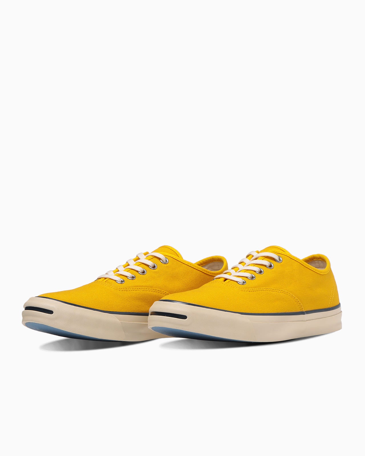 最後にご紹介するのが、アーカイブモデルをベースにしたジャックパーセル。IVYルックに見られる内羽根仕様を採用した品のあるデザインが特徴だ。1973年のアーカイブである「ウィンドジャマー」をベースに、テープラインや踵の割縫いパターンなどのデザインを落とし込んでおり、アイコンでもあるトゥのスマイルやヒールラベル、テープラインを爽やかなブルーにアレンジしているのも見どころ。春らしいオールホワイトのほか、着こなしのアクセントとして活用できるマスタードもラインナップしている。