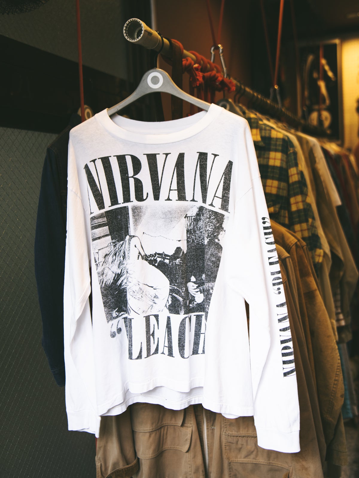 ファッションアイコンとしても絶大な人気を誇るカート・コバーン。彼が率いたニルヴァーナの1stアルバムのジャケット写真がプリントされた希少なロンT。「半袖Tはよく出回っていますが、正規品のロンTをあまり見ないので、これはレアです。袖にも「NIRVANA“ BLEACH”」とバンド名とアルバム名が両方プリントされていますが、ユーロボディということで比較的手ごろな価格になっています」(白岩)。