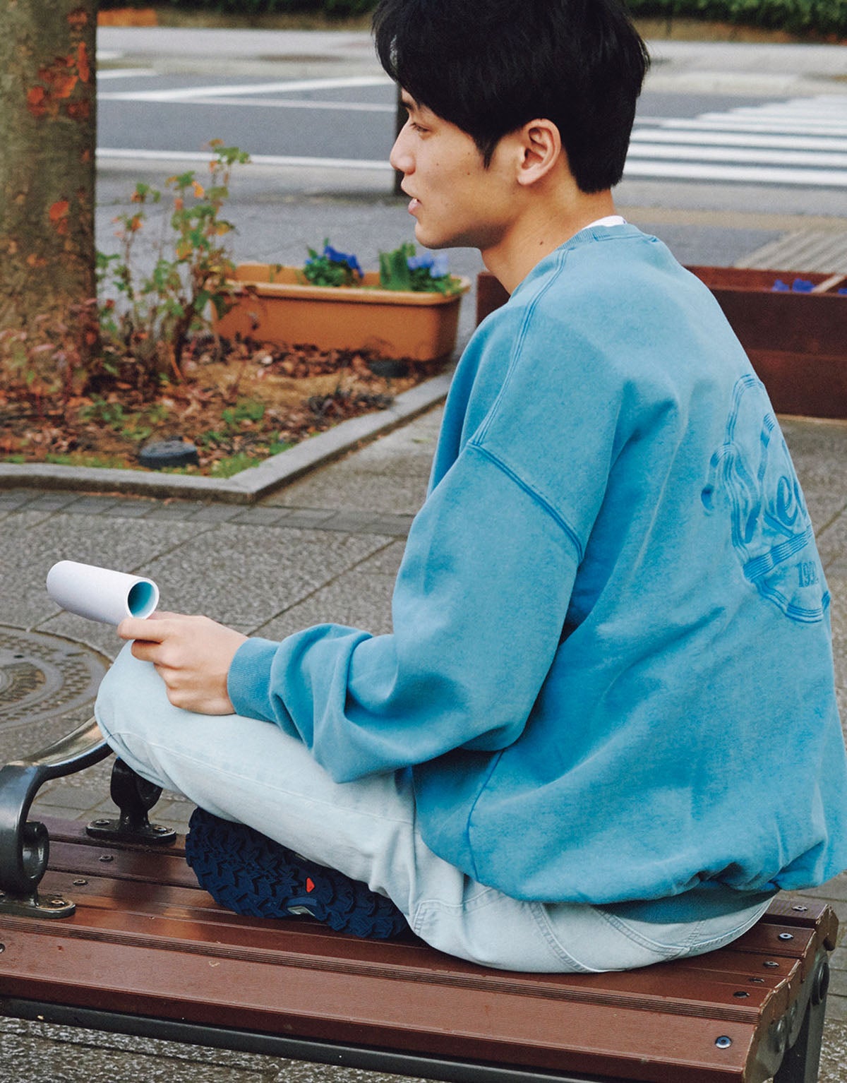 林太郎の誘いに乗って2人で読み合わせすることに。クールに見えて意外といいヤツなんだな…。お互い、もうすぐ課題の最終発表だから熱が入る。そんな日は背中のビッグロゴが映える一点突破な1枚で、気持ちから入るっていうのも大事。