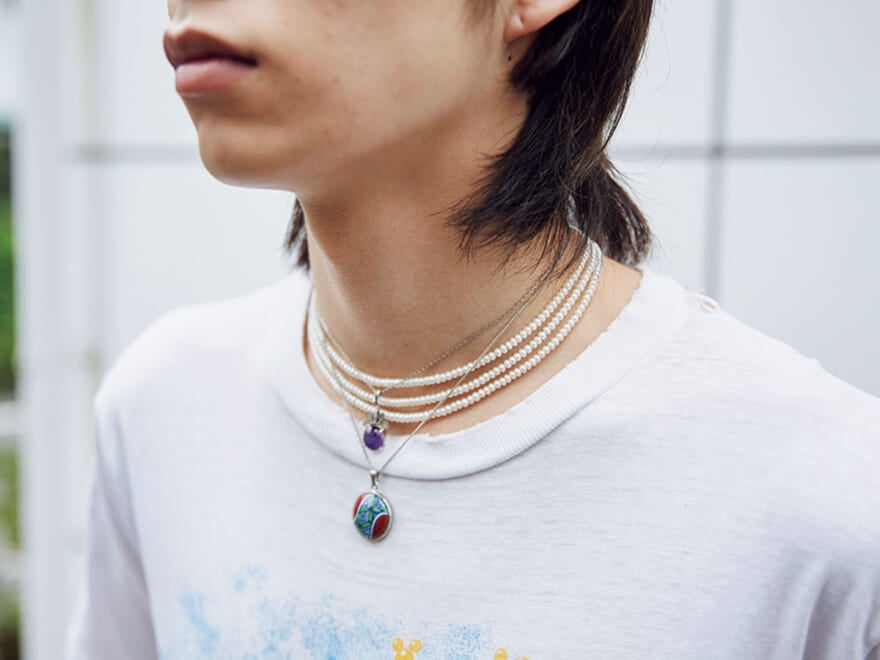 「Tシャツの首もとってどうしても物足りなさを感じて…。最近髪を伸ばし始めてから、ピアスがしっくりとこなくなったこともあり、この夏は首まわりをアクセサリーで盛りたいんです。何をつけるかはTシャツのネックの詰まり具合を見て判断。これで似合うアクセや目立ち方も一気に変わるんです。例えば首まわりが開いているとき[2]は、カラーを足して華やかにしたい。逆に詰まっているもの[4]は、チョーカーっぽく盛るとちょうどいい。まだ鏡の前で試行錯誤していますが、洋服を選ぶときと同じで、足し算ばっかりではなく、抜くことを忘れずに楽しみたいです」