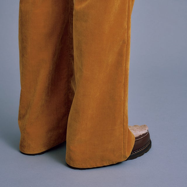 艶やかなベルベットのフレアスラックスは、5ポケット型に茶系色も相まってコーデュロイパンツ感覚でカジュアルにいける。足もとはゴツめの革靴でやや武骨に。