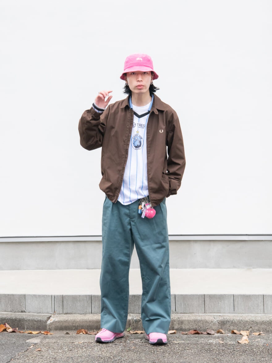 「発色のいいピンクを差し色に、茶色やブルーグリーンを投入して色合わせを楽しみました。中にゲームシャツを着てスポーティなテイストにまとめています。腰にぶら下げているサイコロ型のキーホルダーも、実はステューシー!」