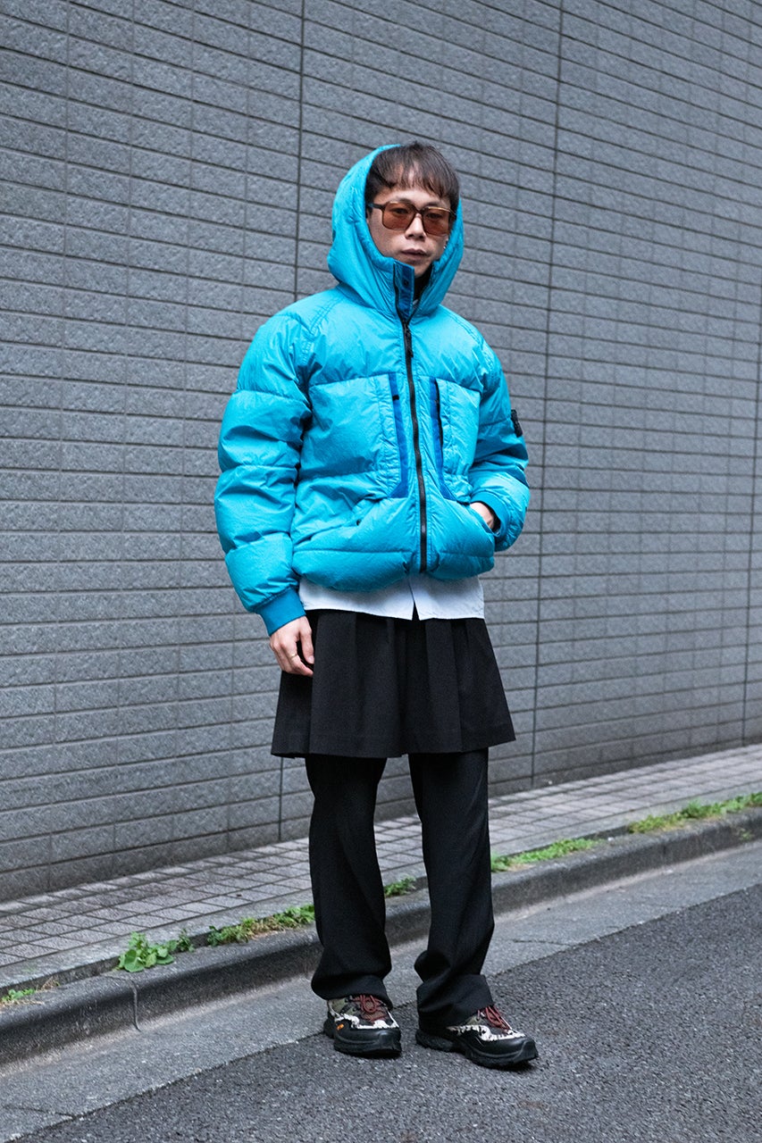 「ストーンアイランドはいつか欲しい憧れの名品ダウン。このカラーとサイズ感でひと目惚れしました。フードまでしっかりとダウンが詰まっているのにすごく軽く着やすいのも◎。今回はスポーティ・アウトドアなイメージのモデルをあえてモードと合わせて着こなしてみました」。
