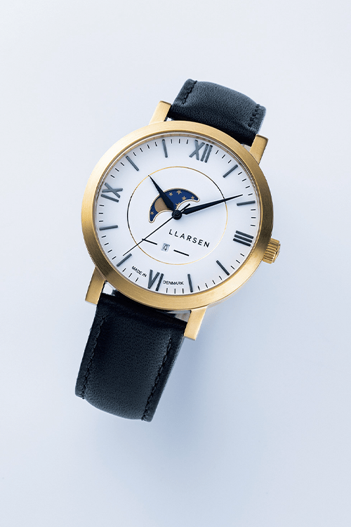 自然豊かな地元デンマークのアトリエで製作も行うエルラーセン。北欧らしいミニマルなデザインにムーンフェイズの小窓がのぞく。シックな表情の中に挿絵のようなコントラストが生まれる。