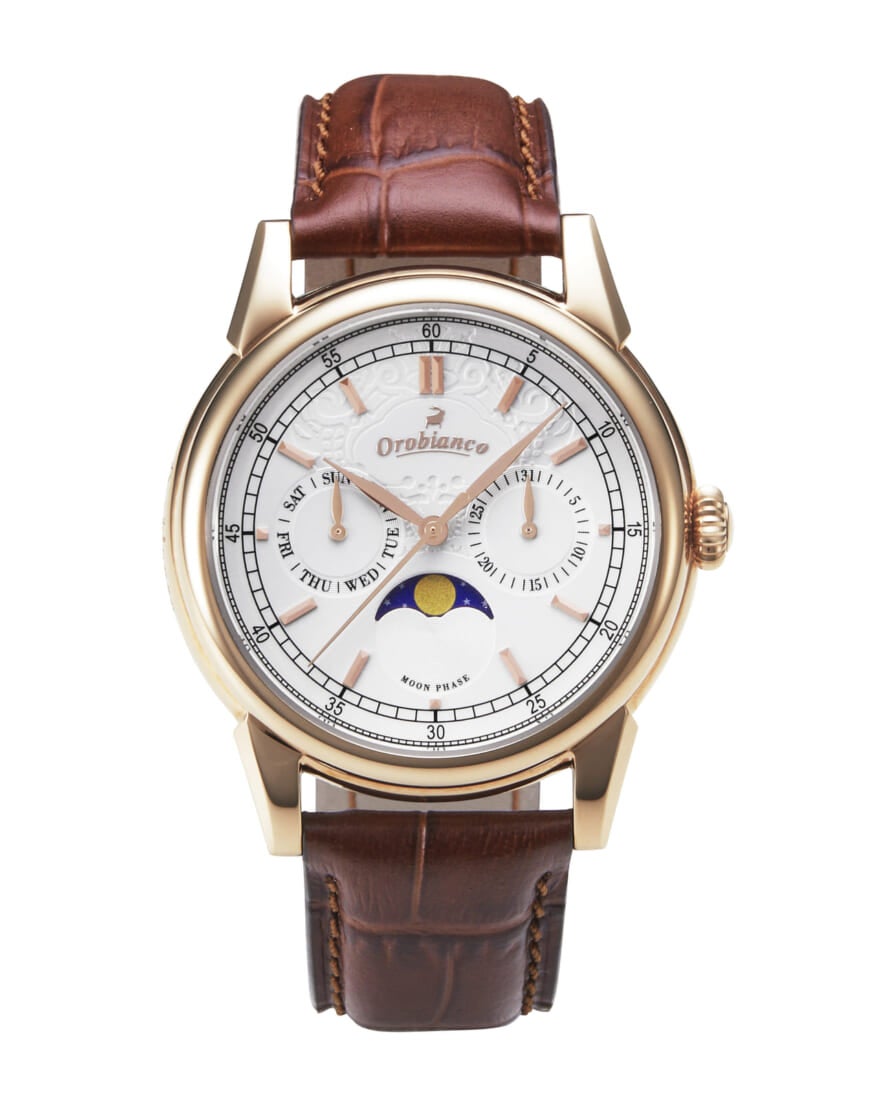 文字盤に浮かぶ金色の月。これは月の形を知るムーンフェイズ機構で、会話のきっかけにも役立つ。レザーアイテムに強みを持つオロビアンコらしい革の上質さもこの時計の魅力のひとつ。