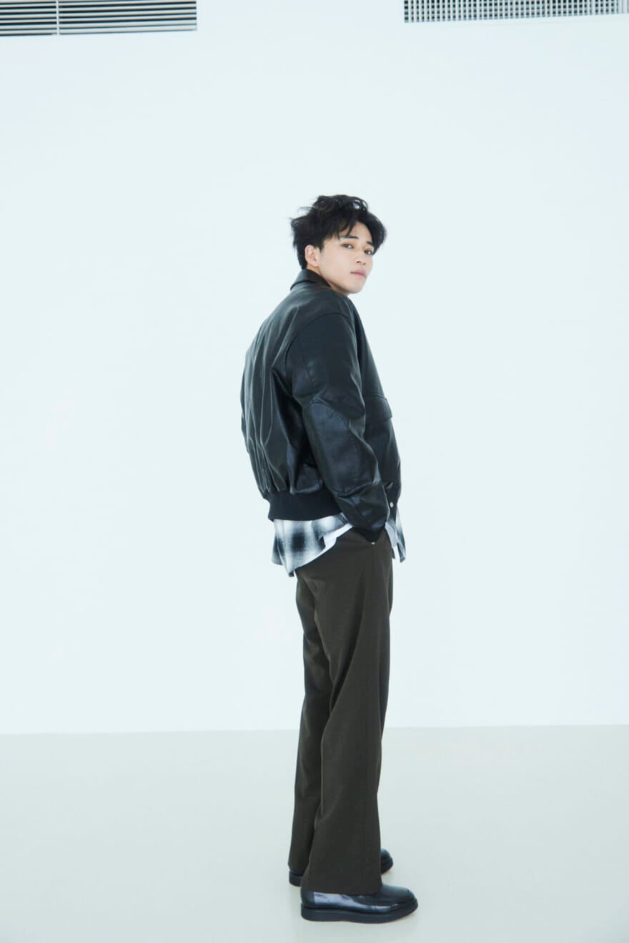 1930年代にアメリカ軍で用いられていたA2フライトジャケットをアレンジした一着は、武骨なデザインとは相反する滑らかで光沢感のある素材を用いることで生まれるエレガントな雰囲気が魅力。オンブレチェックのシャツと白Tでアメカジっぽさを意識しつつ、落ち着いたブラウンのスラックスで品のよさも漂わせるのがイマドキ。