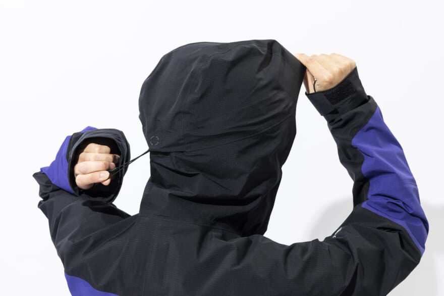 こちらは素材から製造過程まで、製品全体を通して環境負荷に配慮した防水ジャケット。GORE-TEXが新開発したPFC(過フッ素化合物類)フリーの ePE メンブレンを採用。表面の撥水加工も PFC フリー、裏地の染色には廃水を削減した「ソリューションダイ」を用いている。アウトドアはもちろん、街中でも使いやすいハリのある素材感とすっきりとしたシルエットも特徴だ。