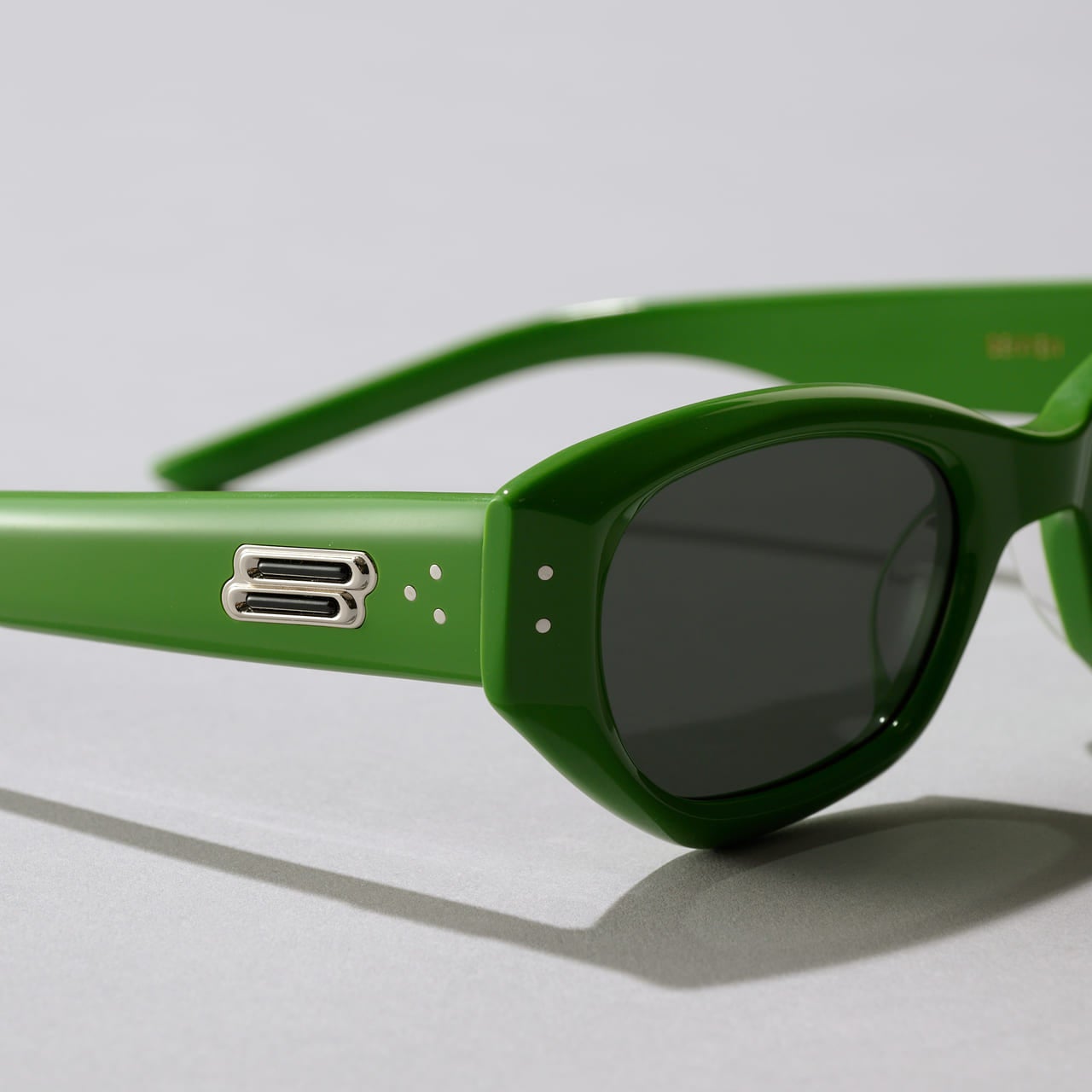 深澤:4のDada RC6と同じく、ほどよくエッジがきいたバタフライシェイプが特徴。トレンドカラーのグリーンをチョイスしてみました。太さのあるテンプルとメタルのディテールがグッドアクセントに。今回紹介した横長のタイプの中ではレンズ幅が一番コンパクトになります。