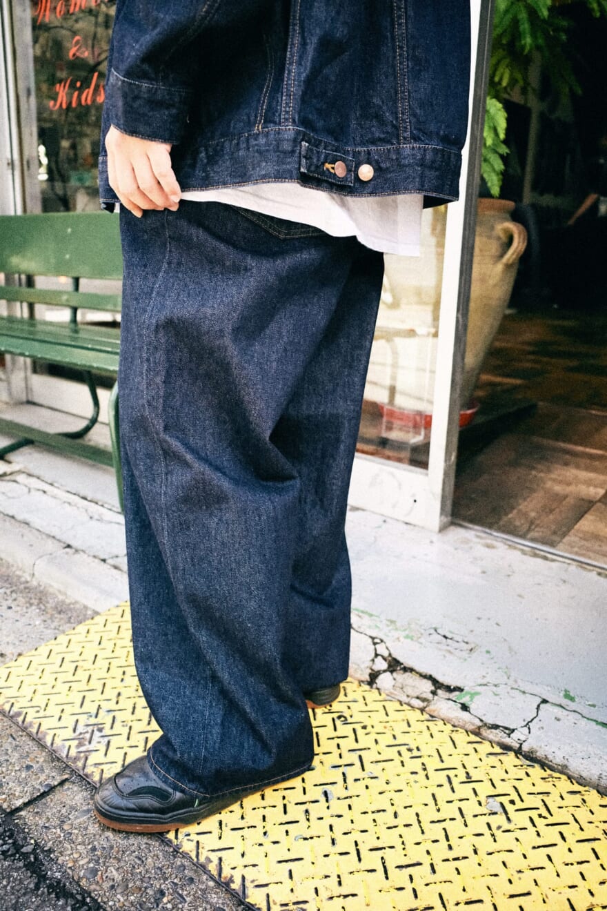 2000年代に流通していたバギーフィットのジーンズを着想に、当時使用されていた綾織の空紡デニムをヘビーブロークンデニム素材にアップデート。