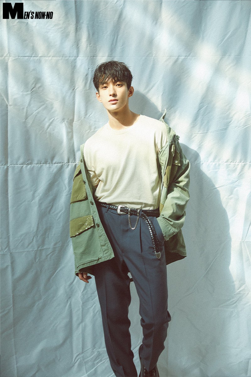 DK 1着目のクラシカルなトラッドスタイルは、デイリーに着てみたいと思いました。タイや眼鏡、七分丈パンツが魅力的ですね。それから2着目の、ヴィンテージ加工されたミリタリージャケットを着たスタイルも、ワイルドな雰囲気が新鮮で好みでした。ウォヌさんもカッコいいですね。彼はもともとファッションが好きですし、スタイルもいいので、服を着こなすのが上手なんですよ。すんなり自分のスタイルに落とし込めてしまう。