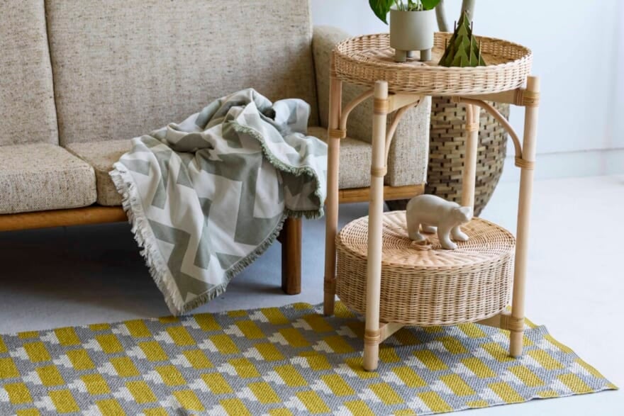 ハンドメイドで仕上げたラタンのサイドテーブルは、トレイが取り外すことができるので、飲み物を運ぶときにはトレーとしても活用できる。