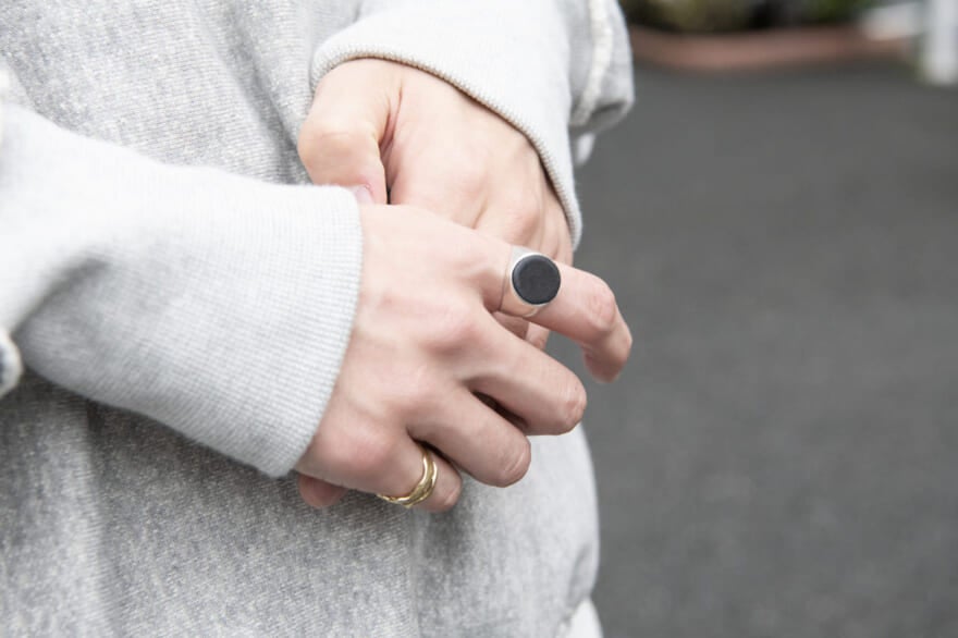 「エツシのシルバーリングは、ブラックの部分がレザーになっているんです! 一年前に買ったのですが、経年変化を楽しみに毎日着用中!」