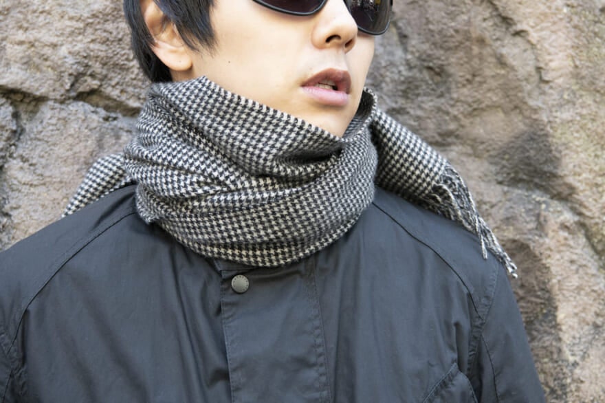 「マフラーは千鳥格子柄を選んでシックなムードを後押し。首周りに柄のあるアイテムや少し明るいトーンを取り入れるだけで、リズムが付いてコーディネートに奥行きが出る気がします」。