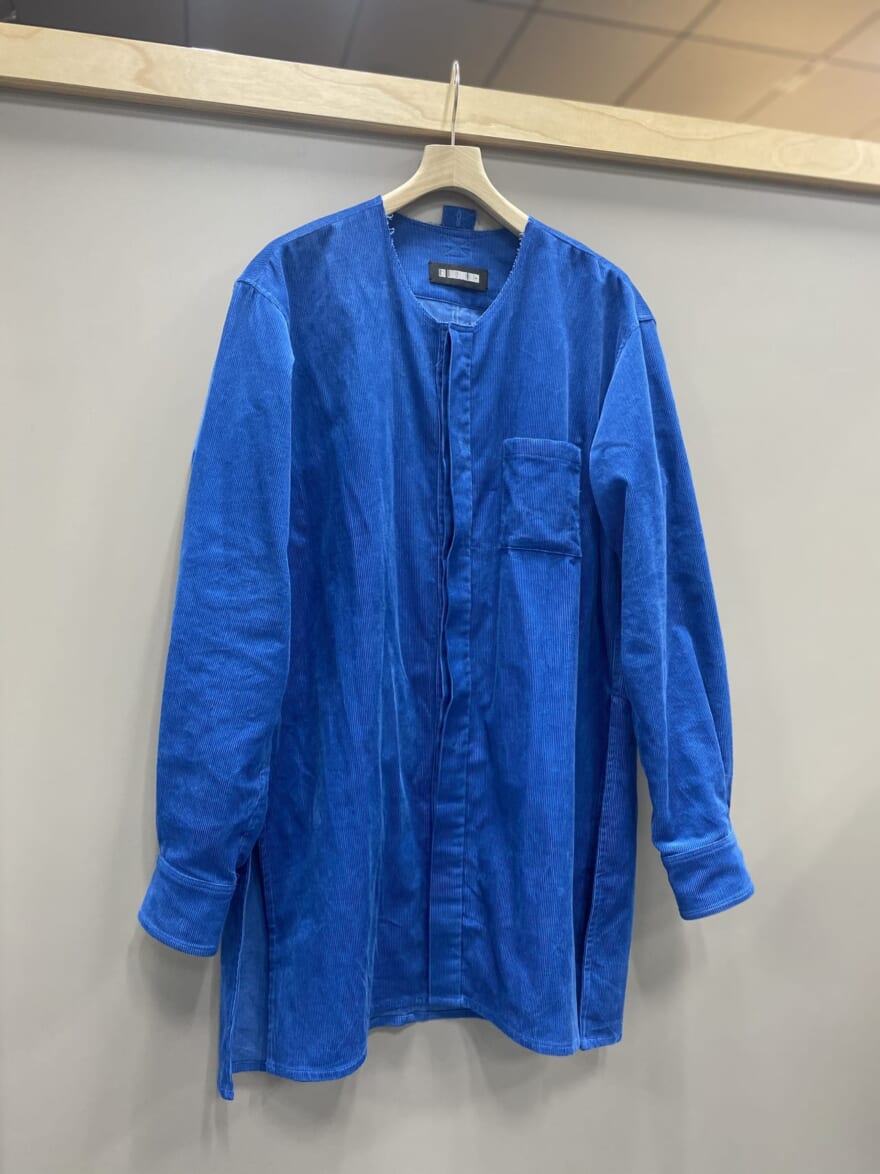 「ヘビロテアイテムというとベーシックなものを思い浮かべる人も多いと思いますが、このシャツはロング丈で鮮やかなブルーでコーデュロイ素材とトレンド寄り。実はこのロング丈がレイヤードスタイルに大活躍してくれるんです! キャッチーなブルーもベーシックカラーが多い僕の着こなしのアクセントに使いやすくて、コーデュロイ素材でも細畝だからアウターにも響かない。見た目に反してヘビロテしまくっています。コートのインナーにスパイスとして入れてあげたり、ブルゾンと合わせて長短のレイヤードに使ったり。秋や春は一枚で着ても十分しゃれて見えます」