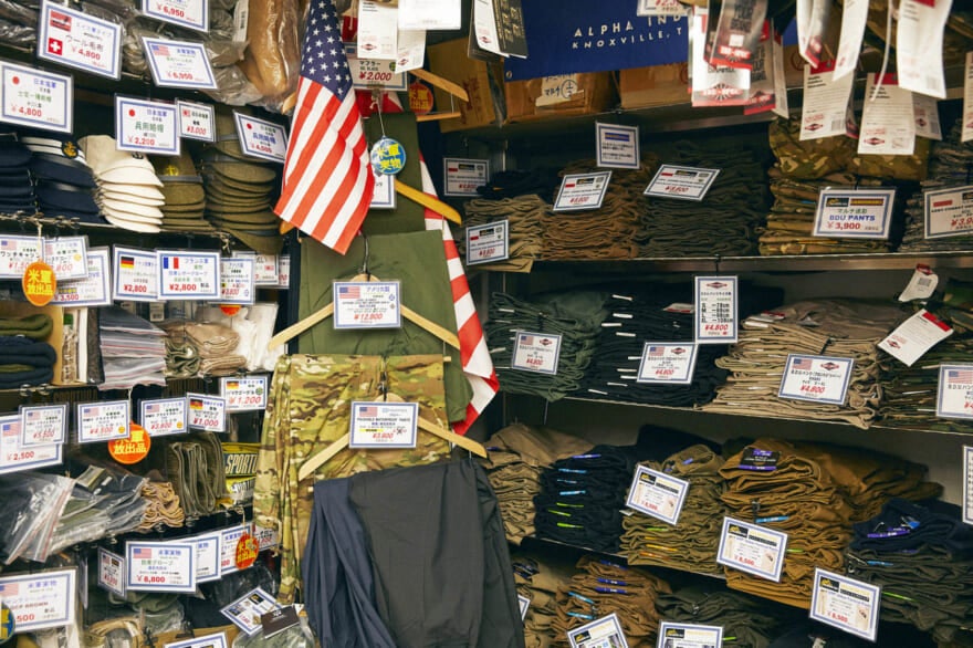 場所をアメ横に移してお買い物続行。3軒目となると、そろそろ予算も折り返し、と思いきや破格のミリタリーアイテムがひしめき合っていた!