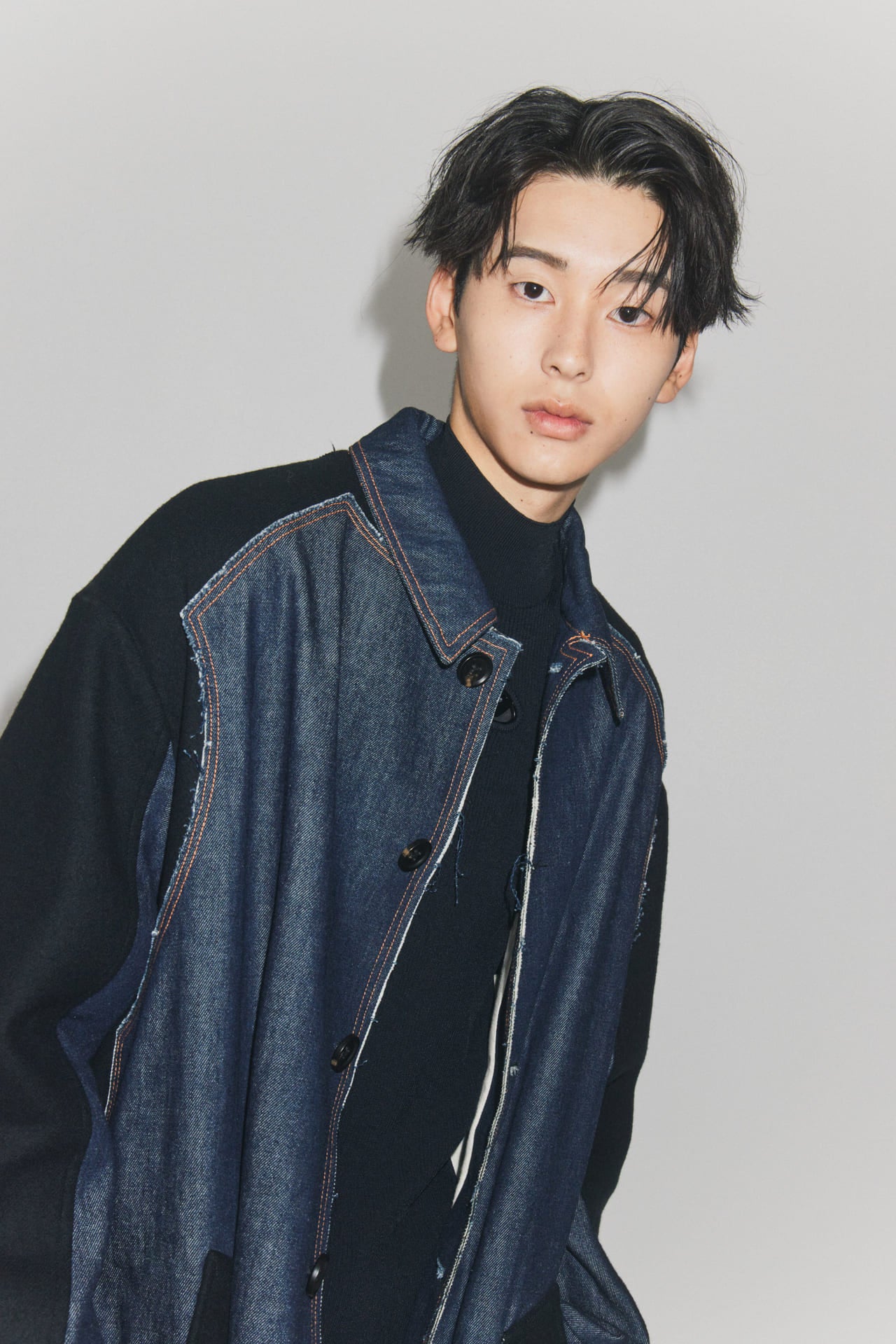 6:4でラフに分けたヘアは、あえて後れ毛を残すことでアンニュイなムードに。抜け感のあるヘアはモードなファッションとの相性も抜群だ。90年代のストリートスタイルをベースに、カジュアルなデニムのロングコートをモードに昇華した。