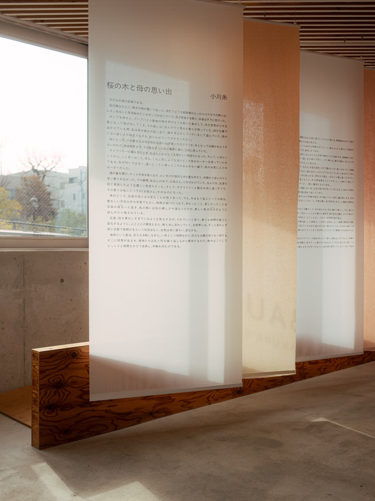 さらに空間を深掘りするのは、異なる分野のプロフェッショナルによる視点。今回のイベントのために美しい桜染を仕上げた染色家・小室真以人さんと、数百年を生きる木の診断も行う樹木医・中村雅俊さんによるインタビューも展示されている。さくらの樹木が秘める類稀なるエネルギーや生命力を、多角的な視点から紐解いていく構成となっている。
