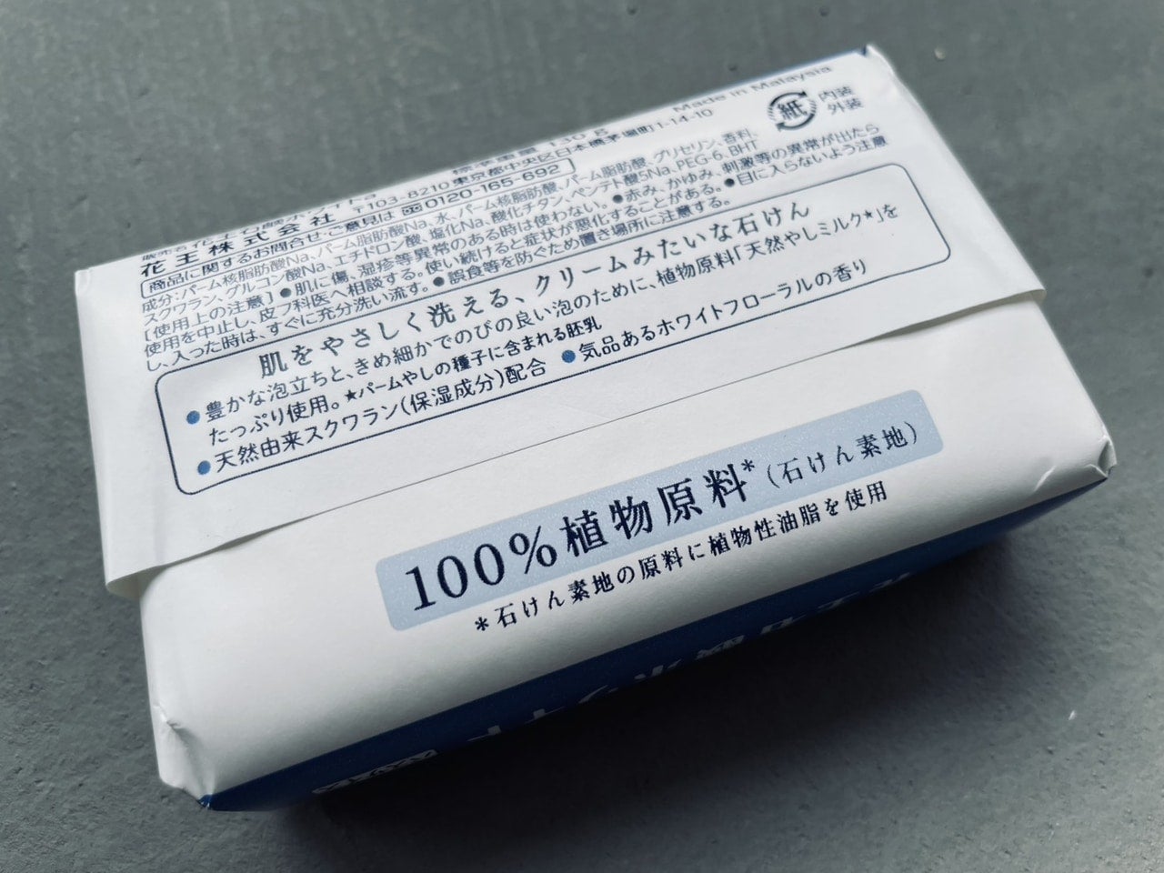 基本的には洗顔料かボディーソープどちらかがなくなったらの代用品として使っているけど、この代用品、花王石鹸ホワイトを使うのが楽しみで。天然植物100%と厳選された原料でつくられていて、軽く泡たてるだけでクリーミーできめ細かな泡が生まれる。洗浄力も洗い心地も良く、さわやかで清潔感のある石けんらしいホワイトフローラルの香り。パッケージや石けんの見た目もシンプルで僕好み。