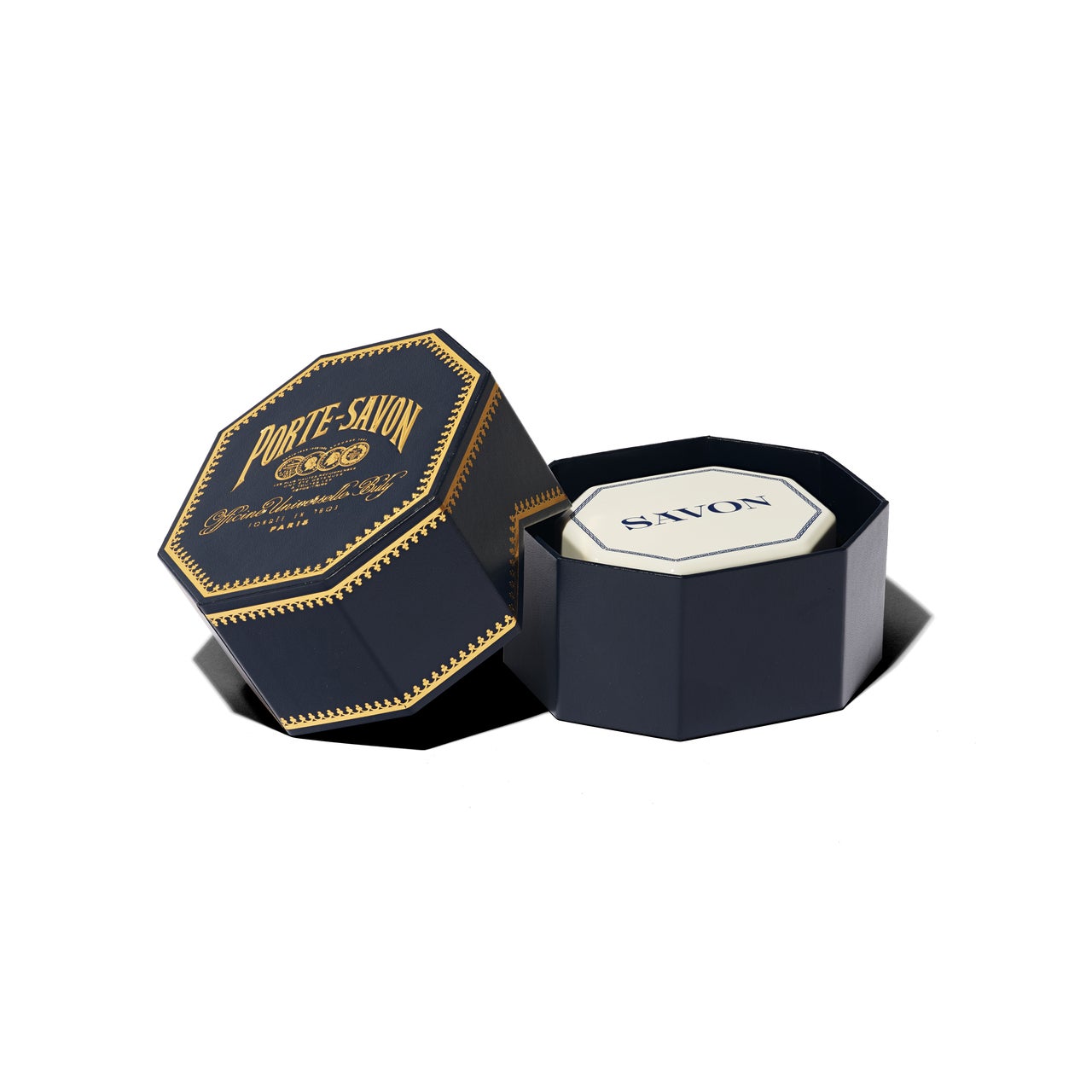 中性せっけん〈サヴォン・スゥペールファン〉の容器としてデザインされた、エナメル仕上げの陶器製ソープホルダー〈ポルト・サヴォン〉。ミッドナイトブルーの八角形の外箱に納められた、このソープホルダーは、それ自体が美しいオブジェでもあります。八角形の〈サヴォン・スゥペールファン〉が完璧に収まり、ネイビーと白が溶け合い、いにしえのバスルームを飾る詩的なオマージュを捧げます。