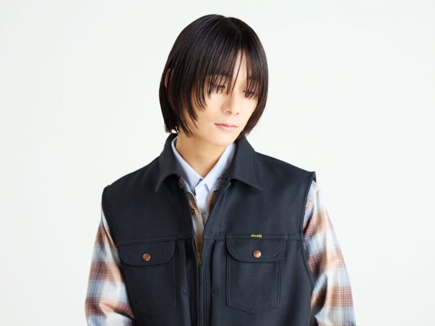 ベスト(ザ スタンダード✕ラングラー)¥8,799/WEGO[TEL:03-6400-5052] シャツ(シュガーヒル)¥46,200/林デザイン事務所[TEL:090-4737-1805] 中に着たシャツ(エンポリウム)¥25,300/ジェットン ショールーム[TEL:03-6804-1970] パンツ(ホーリーインコード)¥9,100/ネクスト[MAIL:holyincodejp@gmail.com]