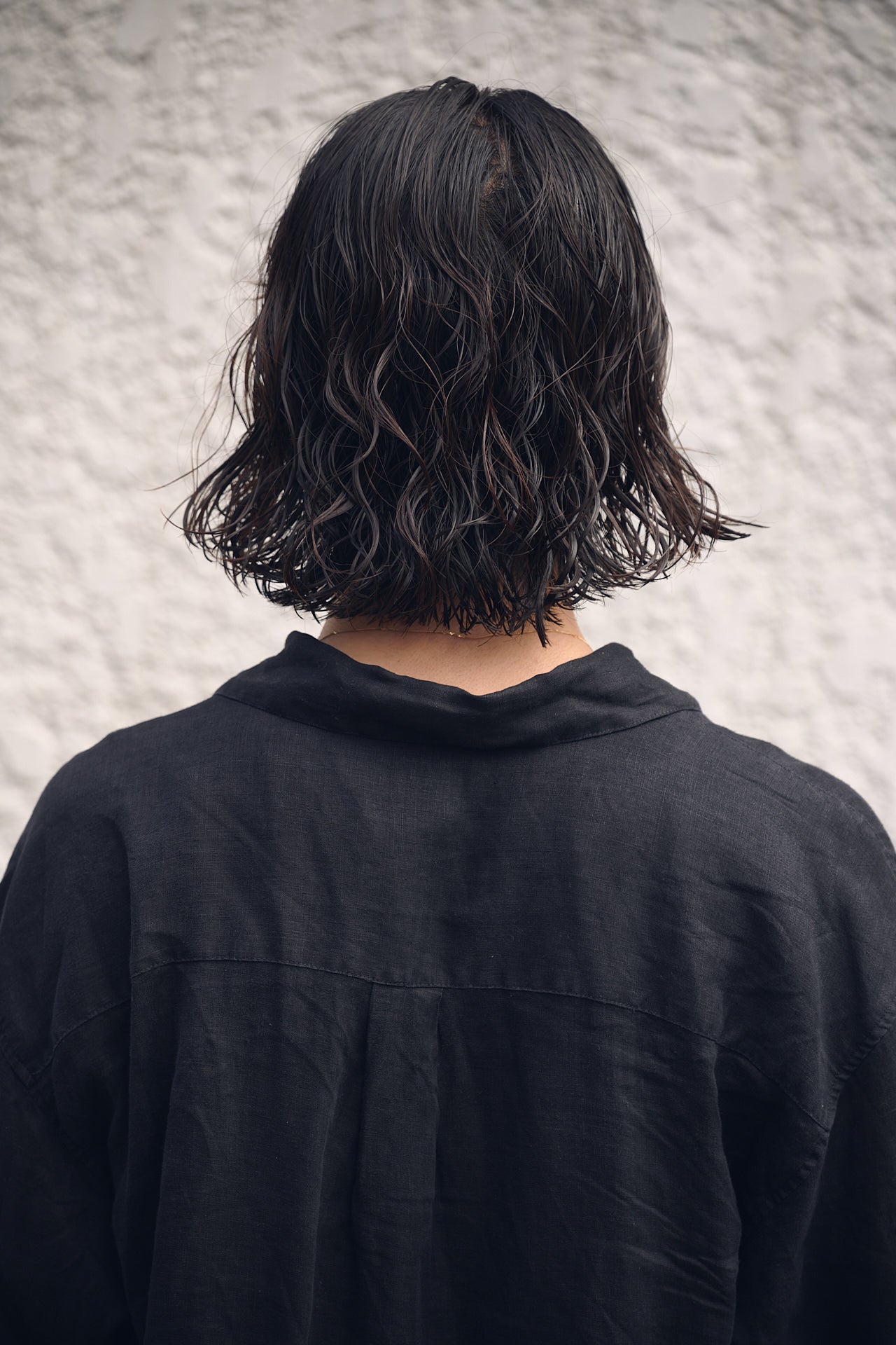 「ボブベースで、前髪は切り込んでレイヤーを入れています。ゆるめのスパイラルパーマをかけ、タイトめにスタイリングしてカジュアルになりすぎないようにするのがポイント。ダヴィネスのヘアオイルをベースに、ロレッタのジェルで仕上げました」。