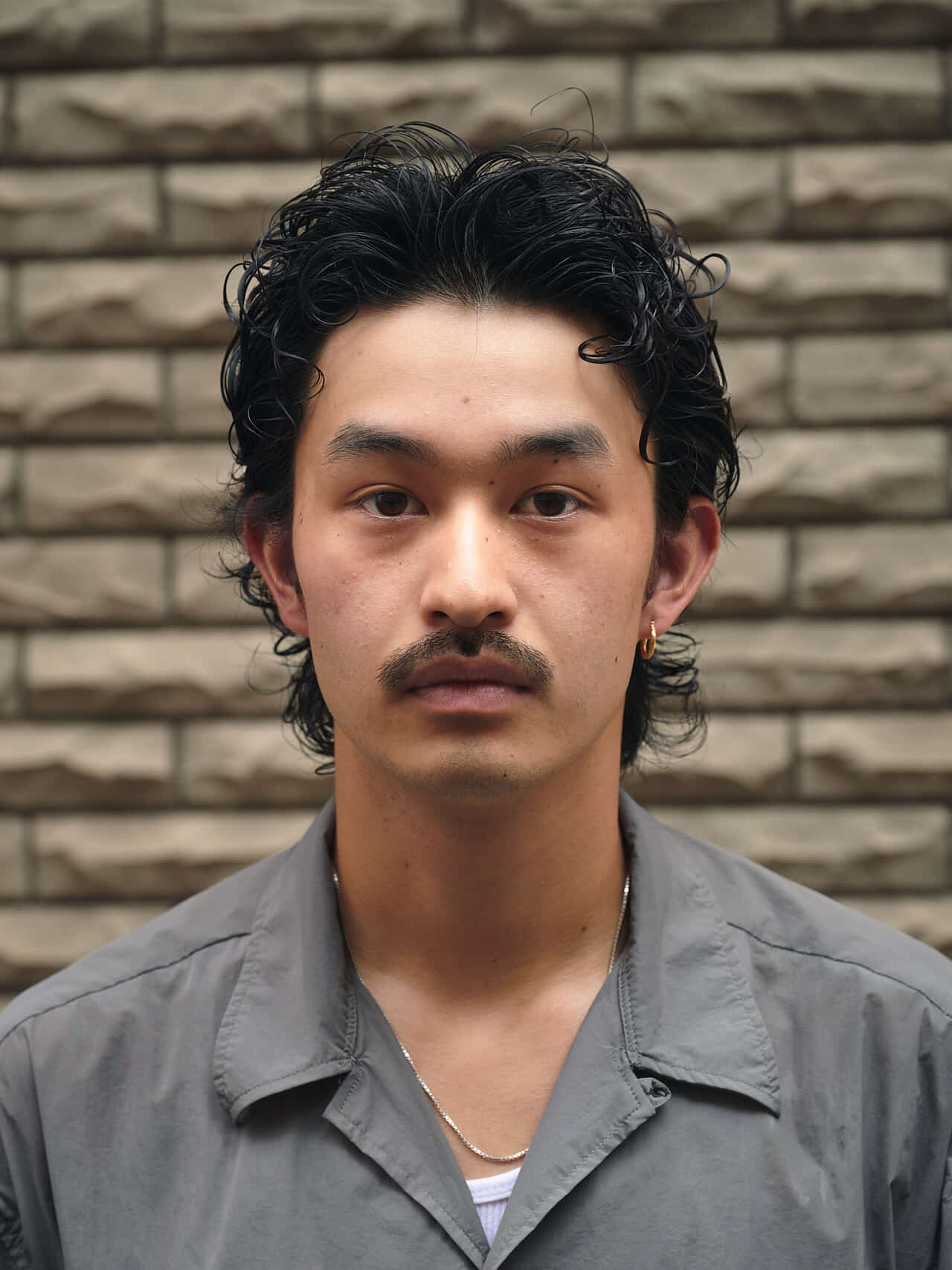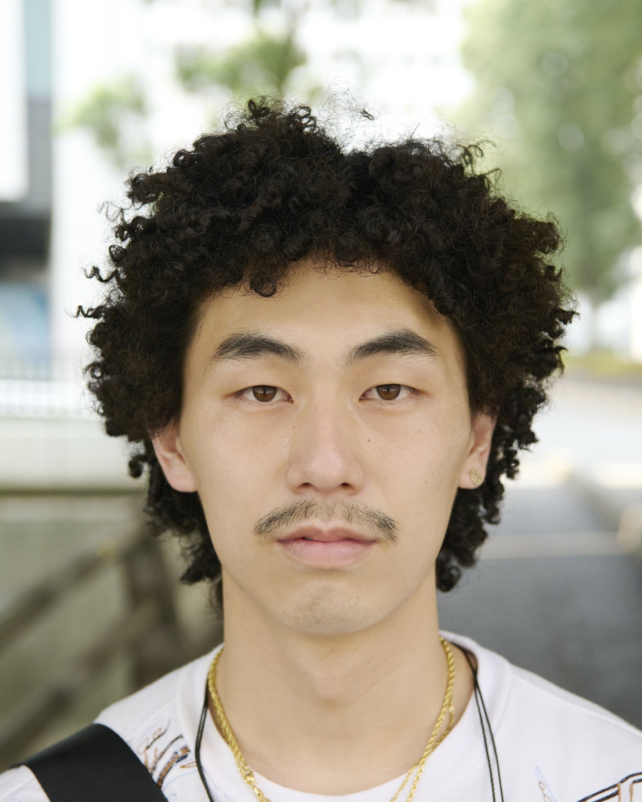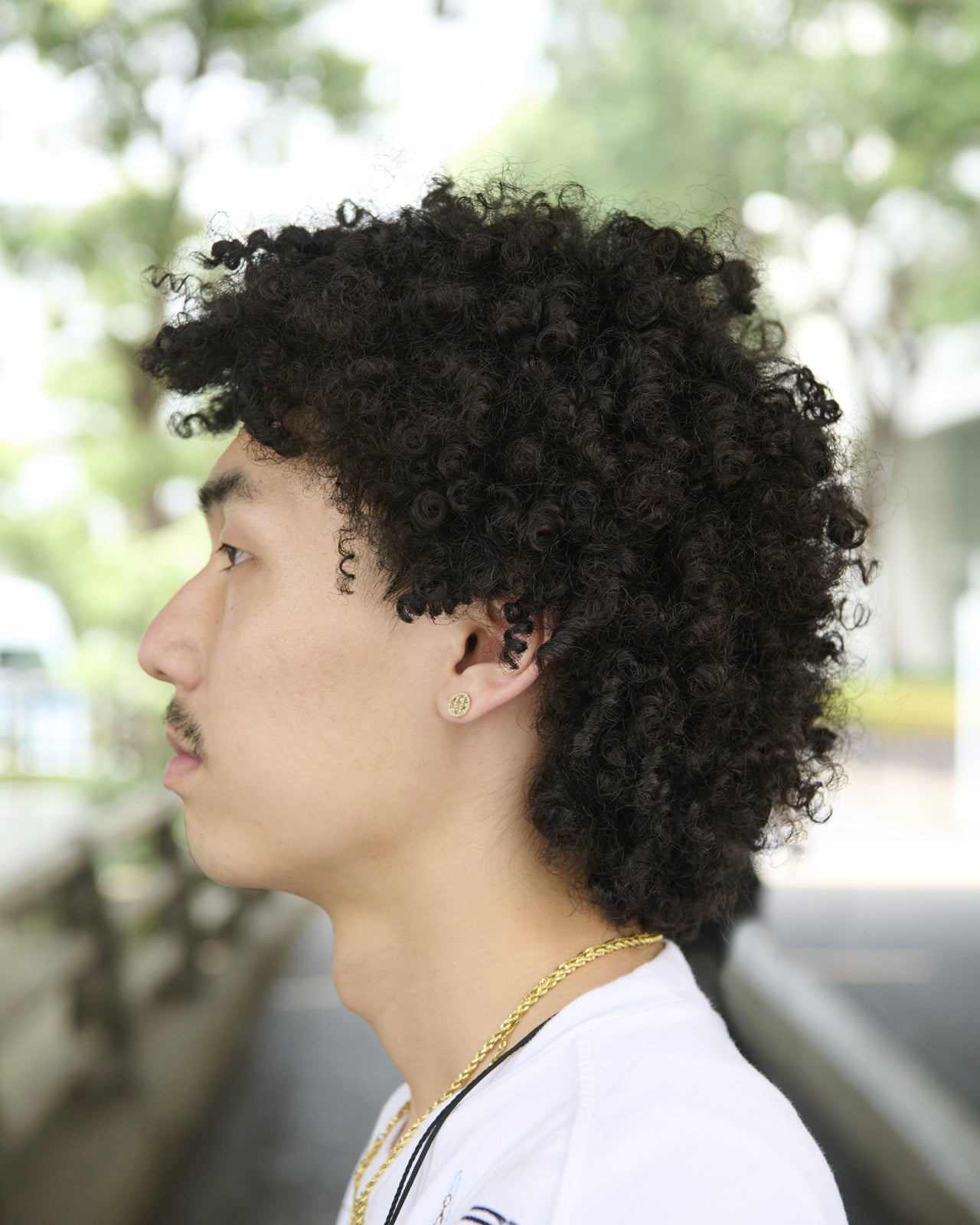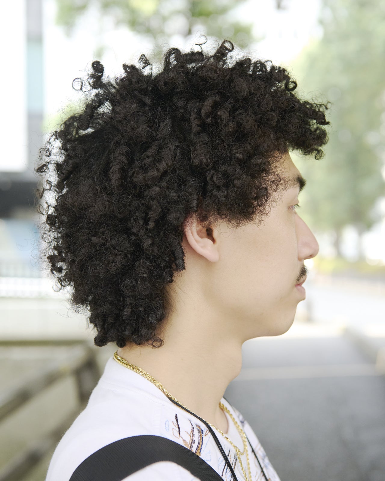 「春先くらいからパーマスタイルをキープ中。とにかくラフにキマるパーマで、前髪は分けても下ろしてもいいレングスに。キャップをかぶったときのえりあしの動きもアクセントになります。ムースでツヤっぽくも、ドライな質感で寝グセっぽくもできます」。