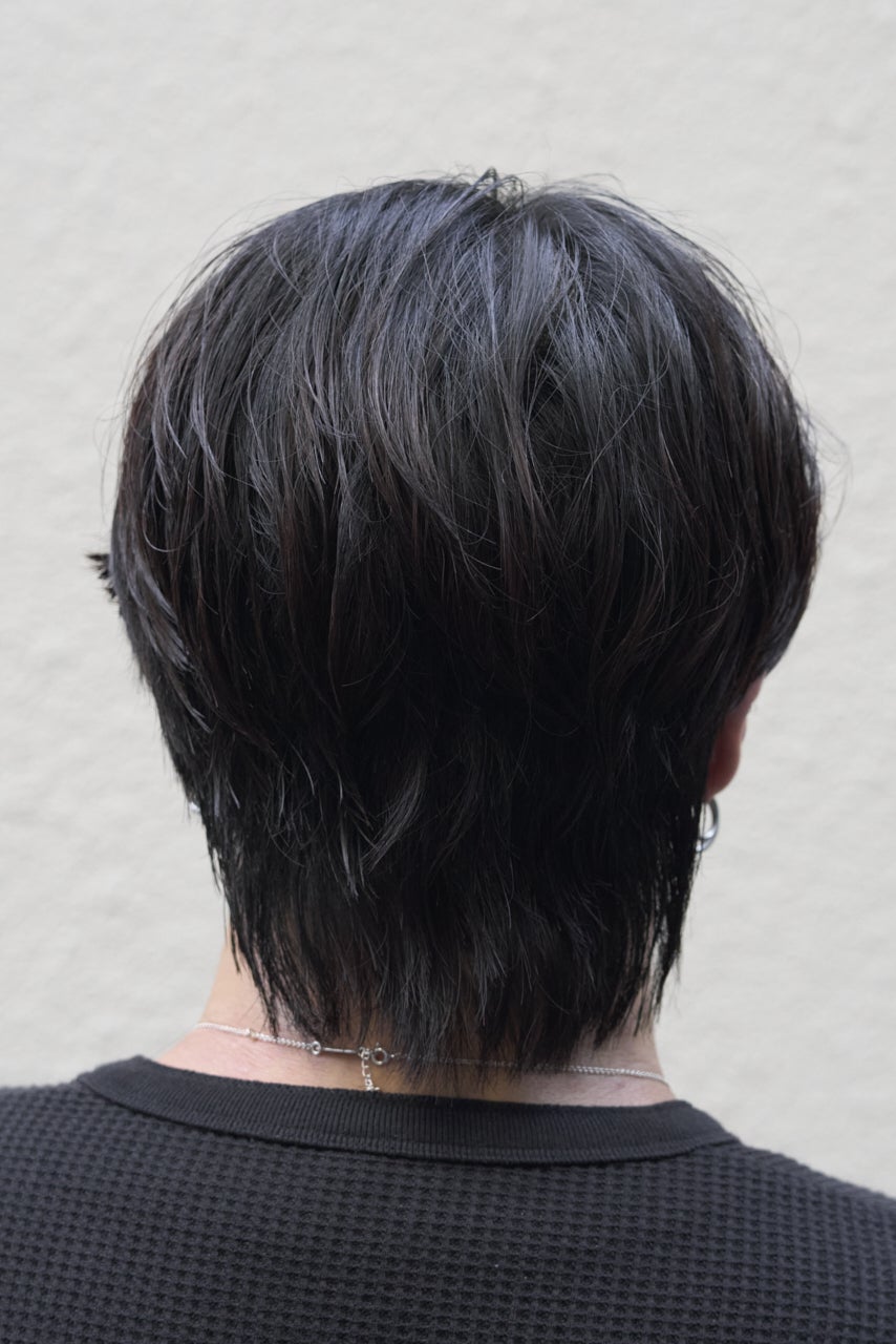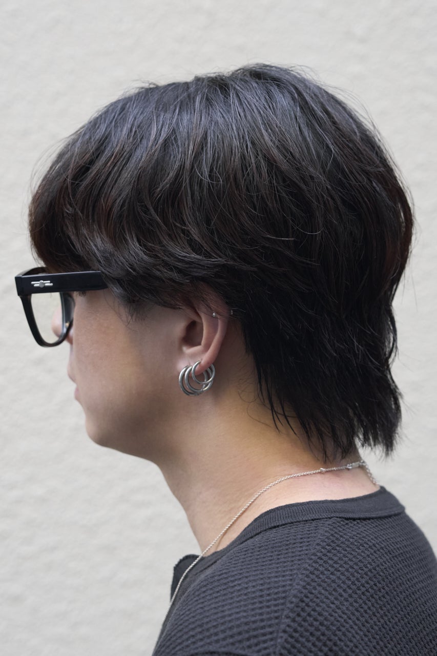 「人と会うときに意外と見られている横顔がきれいに見えるようシルエットを調整してほしい、と毎回オーダーしています。直毛なので、全体にふんわりパーマをかけることで後頭部に丸みを出しています。金木犀の香りが気に入っているtrack Oil NO.3をもみ込み、クセと束感を出しています」。