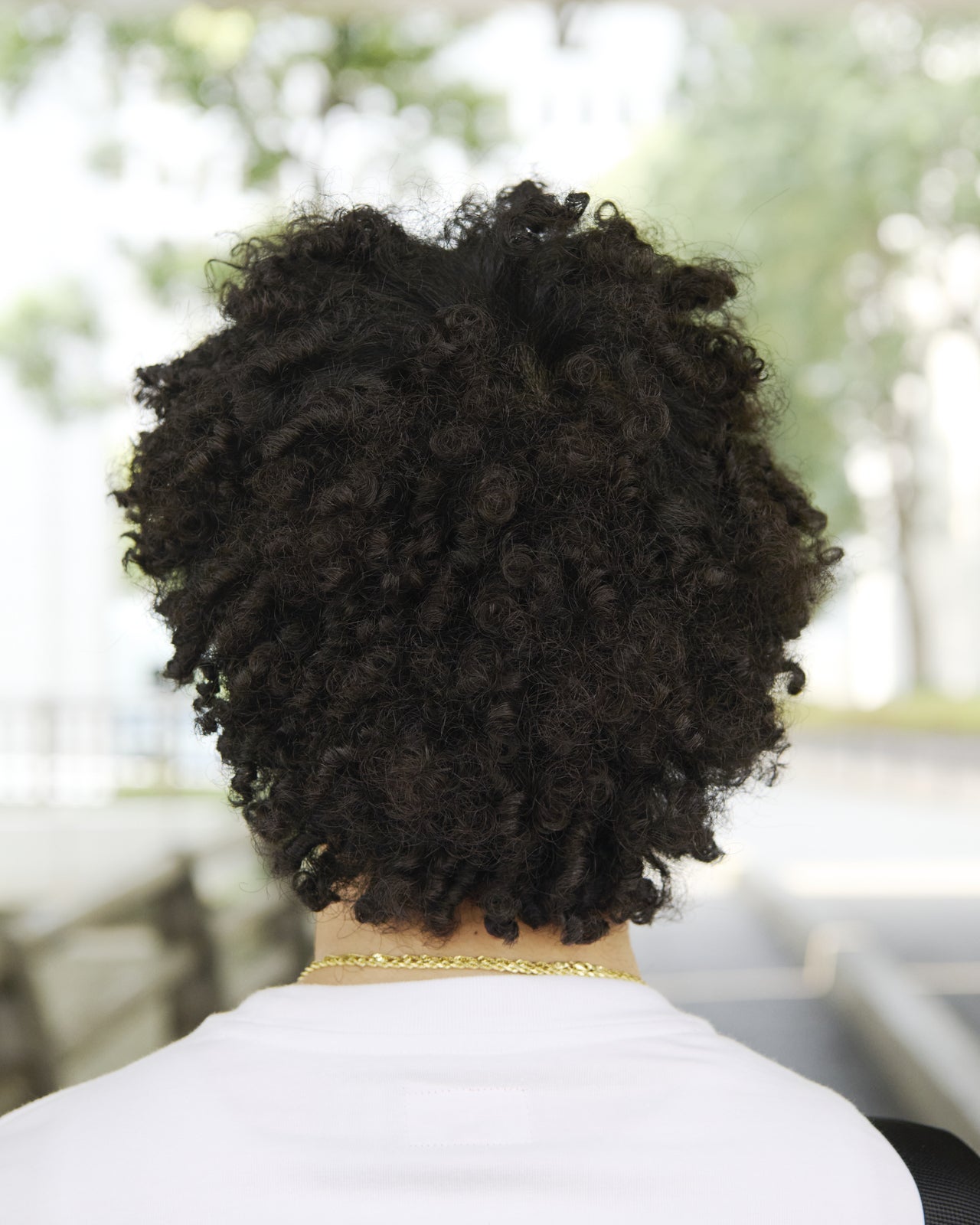 「ずっとロングだったのですが、気分を変えたくてファッションと相性のいいショートアフロスタイルに。カジュアルにもモードにも、ほかと差別化して洋服を着ることができます。コームでほどいたり、手でひねりながらスタイリングするので、けっこう時間がかかります」。