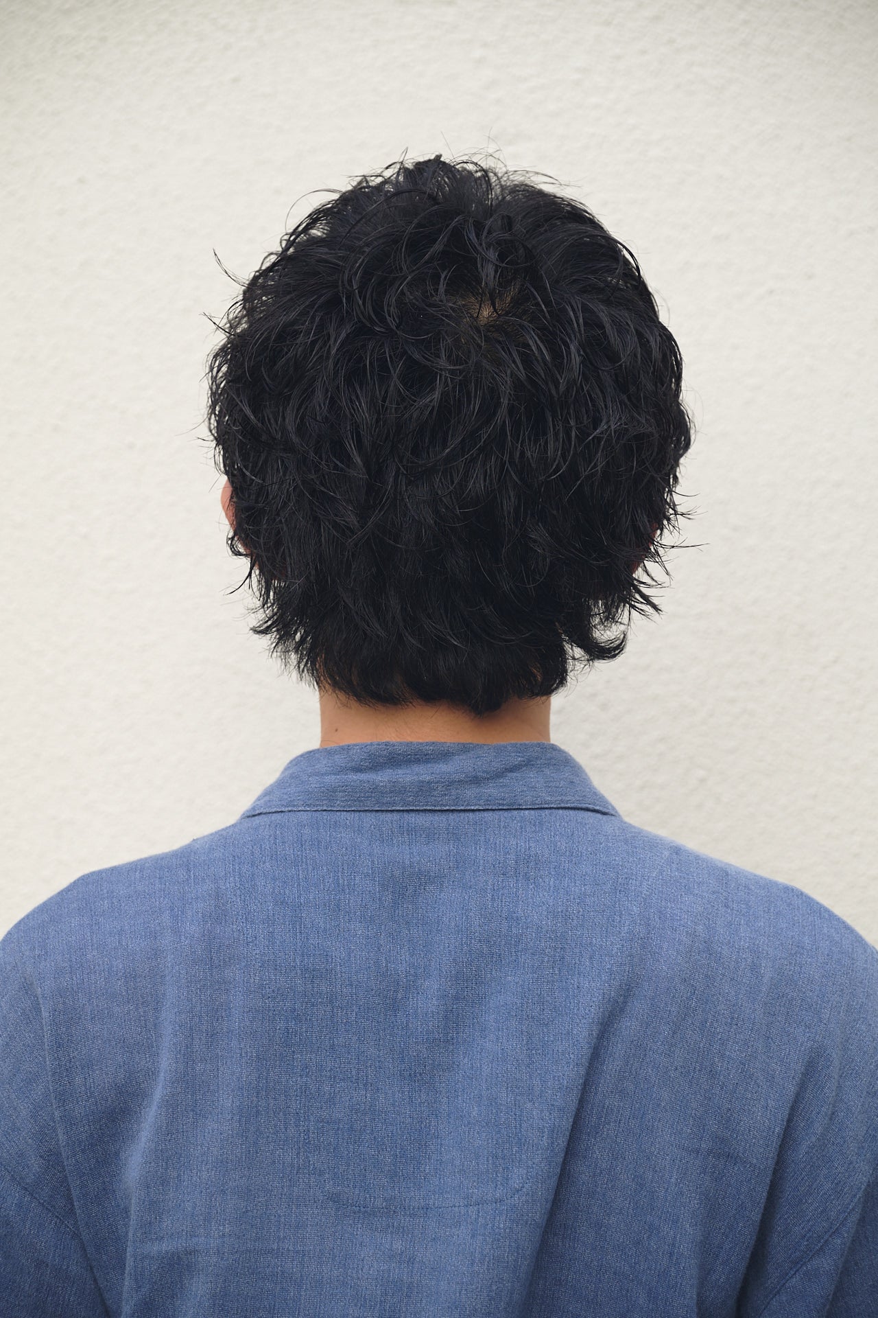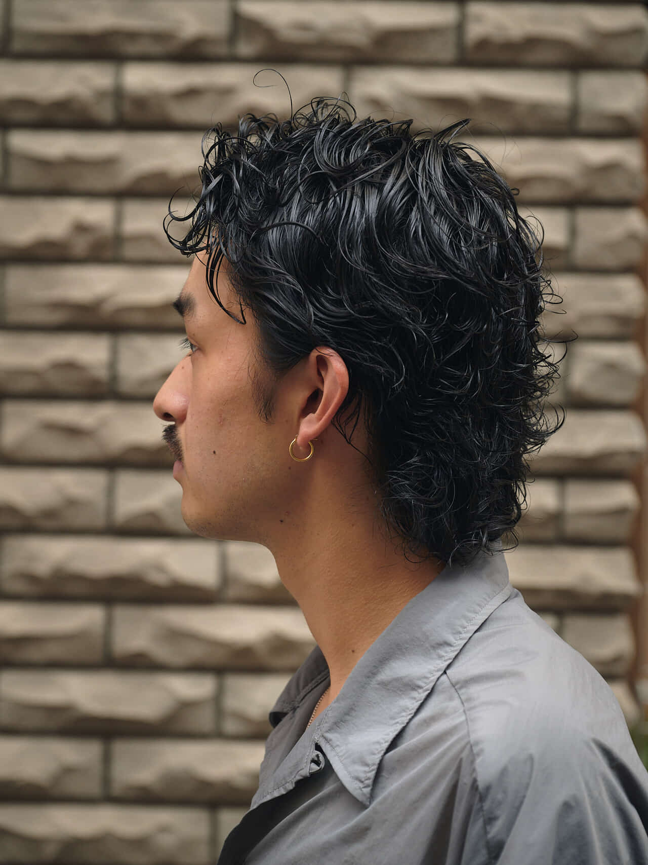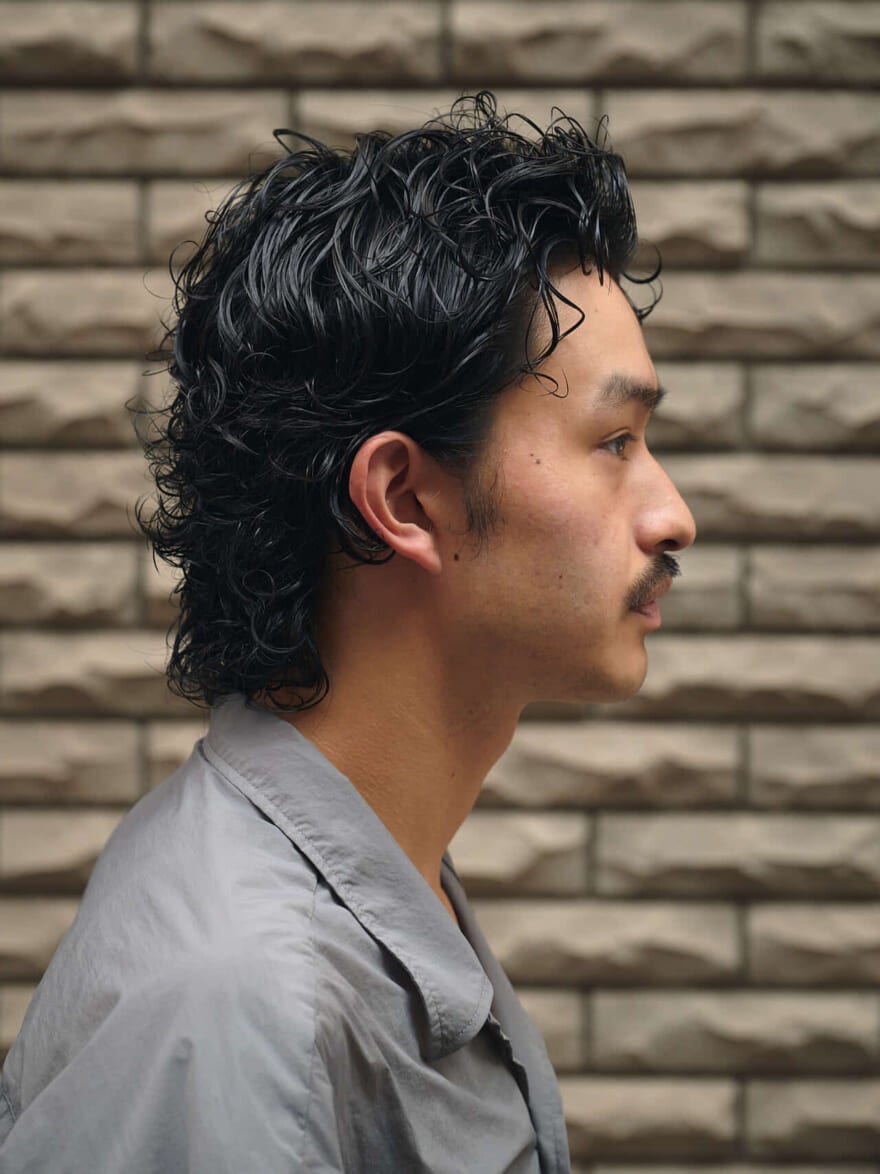 「gustavo piers miltonさんのような、色気のあるオールバックぎみのパーマスタイルをお願いしました。前髪は短めで、アリミノ メン フリーズキープ グリースを使い、サイドの髪を後ろに流してまとめ、パーマ感を出しています」。