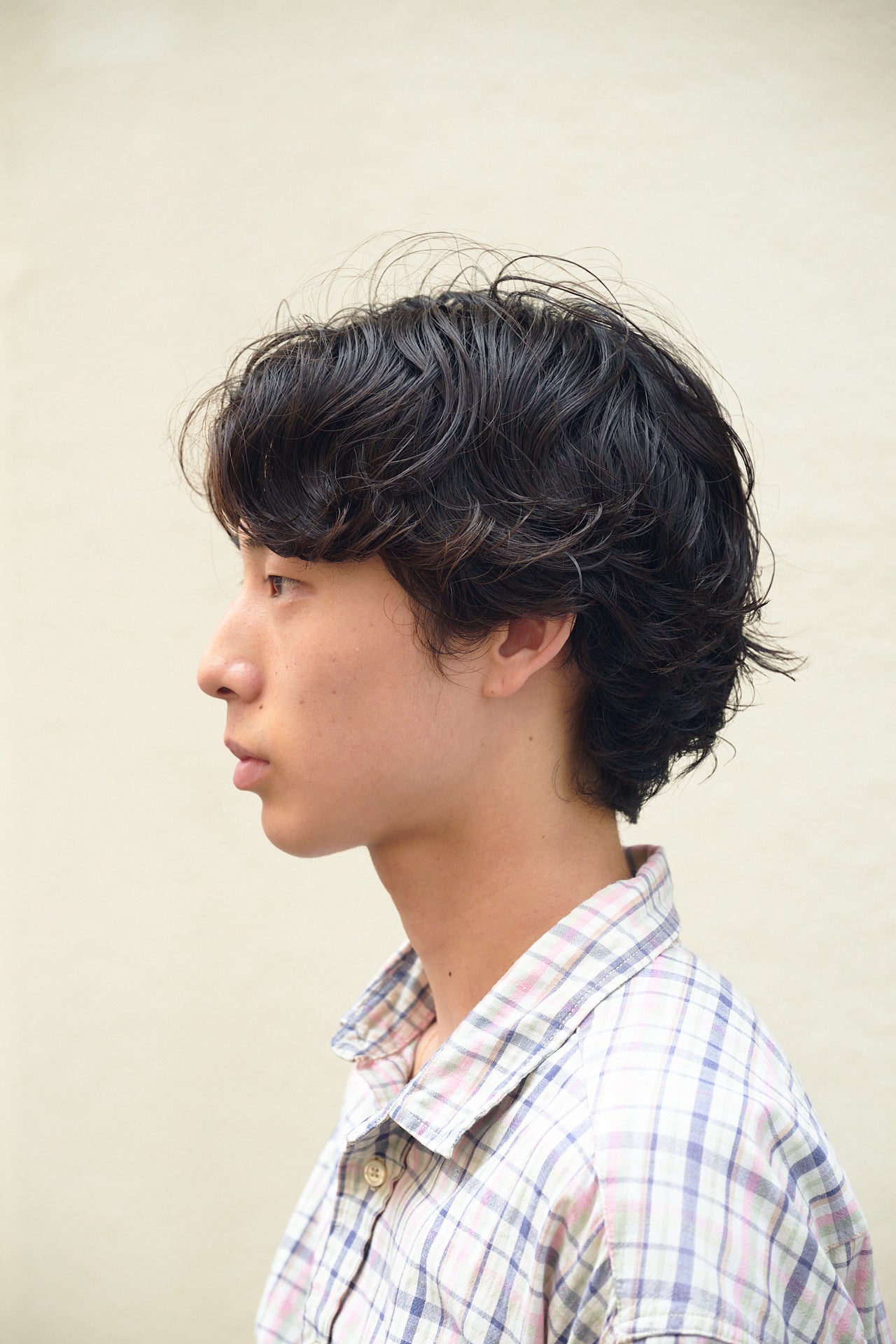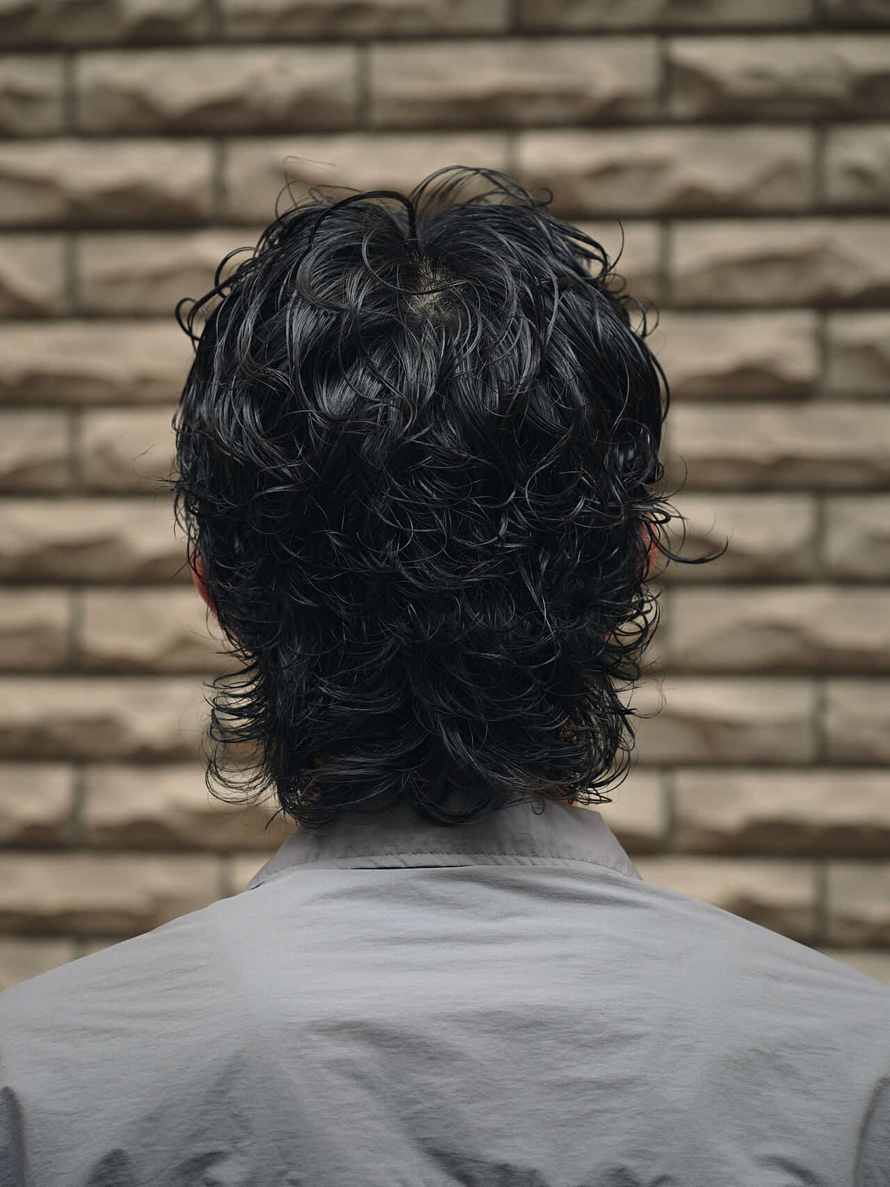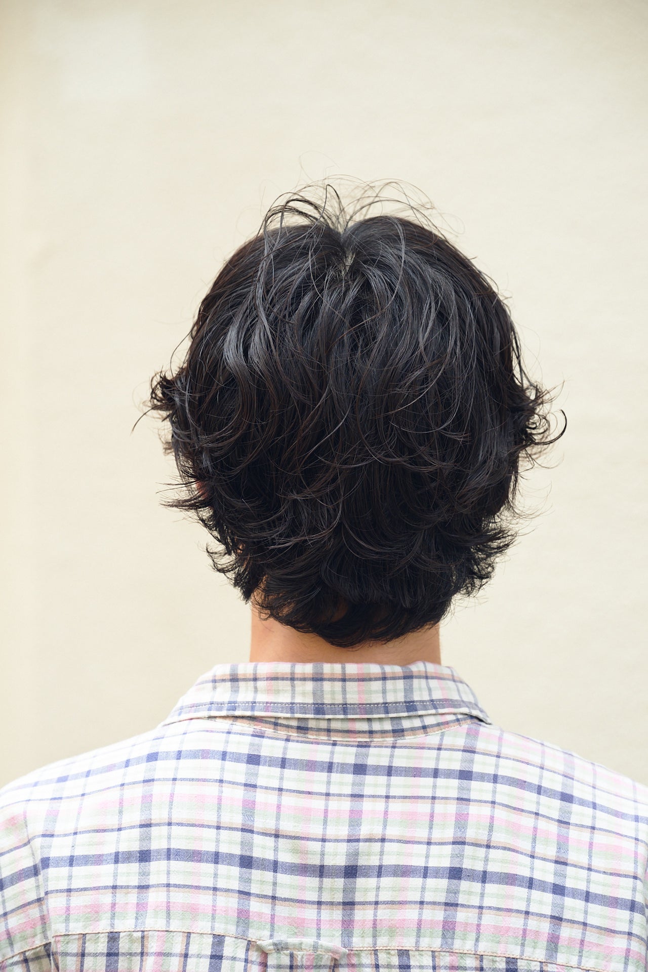 「gustavo piers miltonさんのような、色気のあるオールバックぎみのパーマスタイルをお願いしました。前髪は短めで、アリミノ メン フリーズキープ グリースを使い、サイドの髪を後ろに流してまとめ、パーマ感を出しています」。