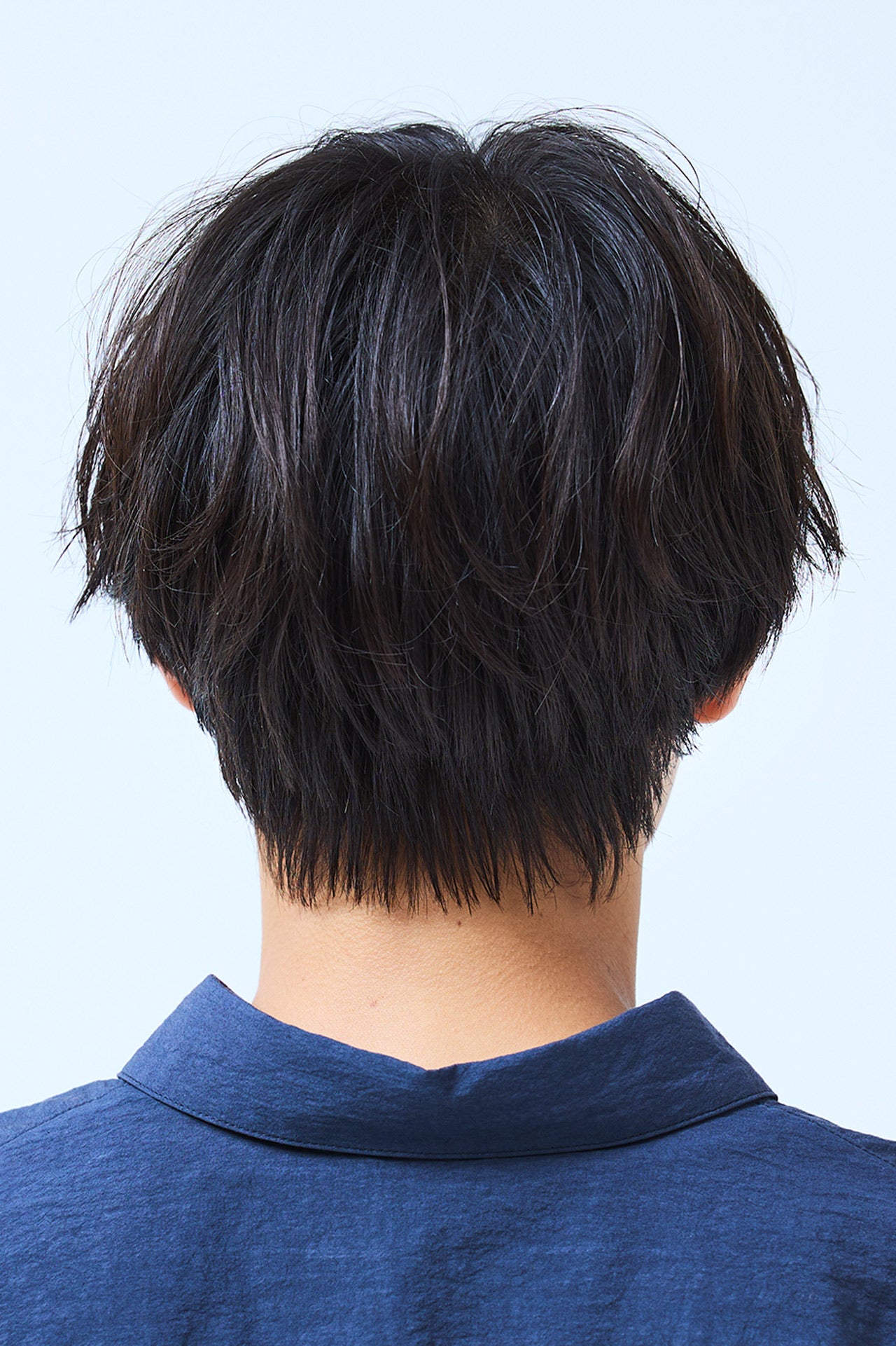 マッシュベースのショートヘアだが、表面のレイヤーはフォルムを整えるくらいの少量にし、動かすための大袈裟な毛束は作らないのが大切。さらに耳周りや襟足なども切り込みすぎず、余韻を残しておくことも、デザインを洒落てみせるポイント。