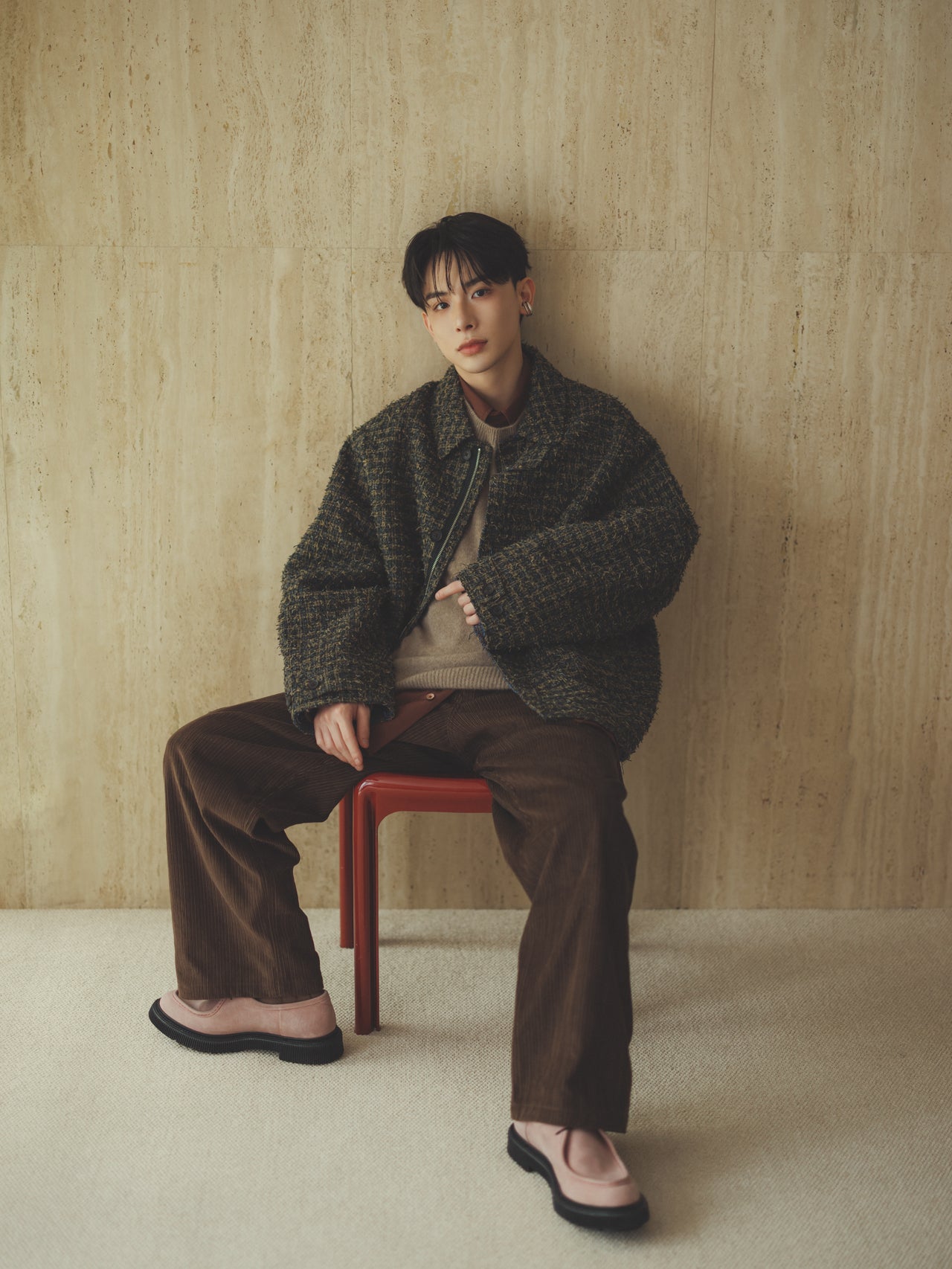 「秋冬らしい素材感を楽しめる“オジみ”のあるチェックのブルゾンとコーデュロイパンツを合わせたルック。スモーキーピンクのシューズを合わせて、コーディネートに少しのハズしと遊び心をプラスしました。ほっこりしやすいアイテムをモダンに仕上げるポイントはシャツのブラウン。パンツの色と繋げることでシャープな印象になり、レトロ感あるアイテムが今っぽくなりますよ」(スタイリスト井田正明氏)