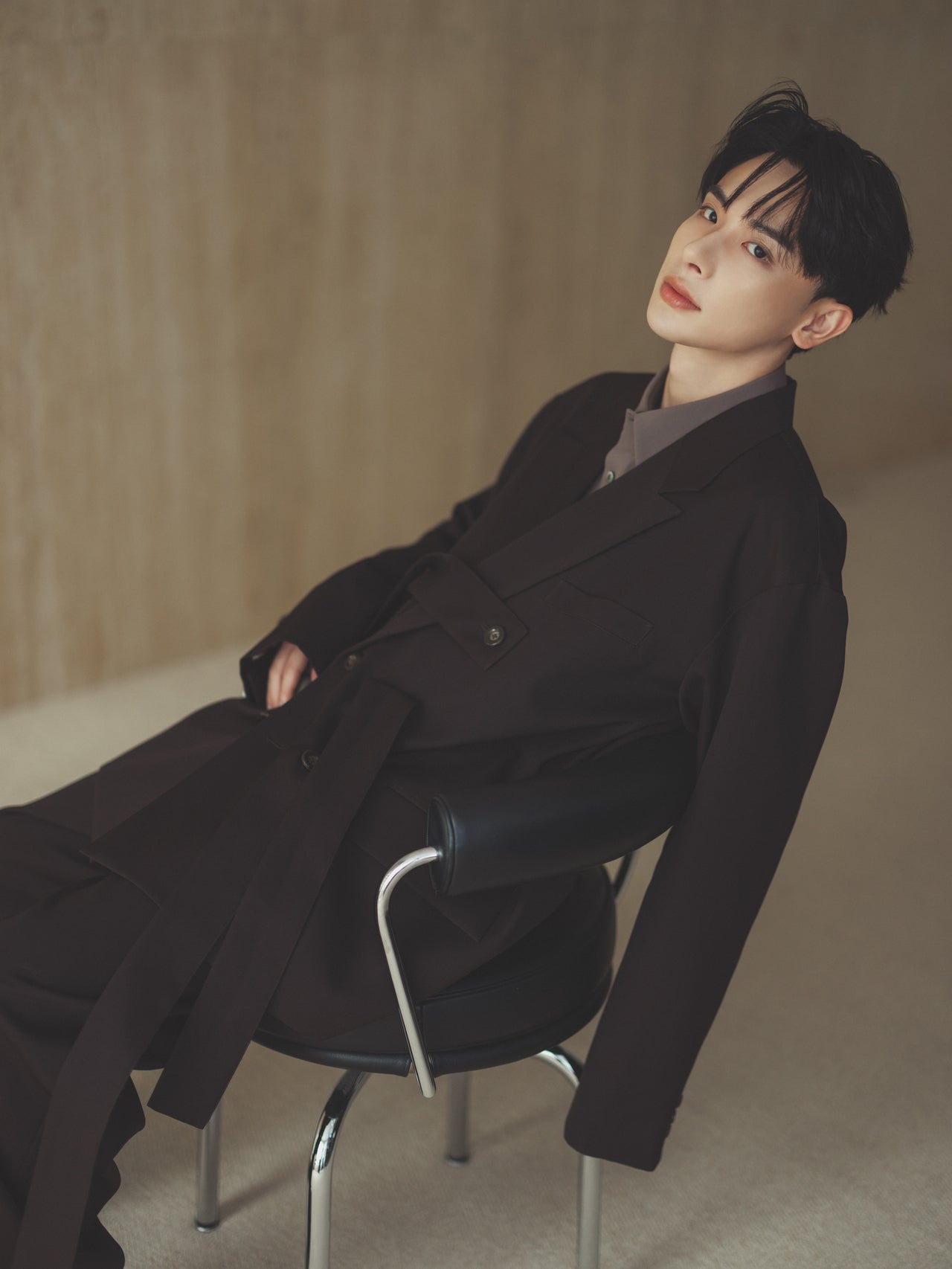 「セットアップのシックな雰囲気に合わせて、いつもよりちょっとクールで大人っぽさが際立つ陰影メイクをマッチング。マットアイシャドウで目元の彫りを起こしつつ、眉もパウダーで描いて表情に強さをプラス。サンドカラーのチークを骨格の陰に入れることで、横顔の立体感もアップ。よしあきさんの違った一面が見えて素敵ですよね!」(ヘアメイク坂本怜加氏)