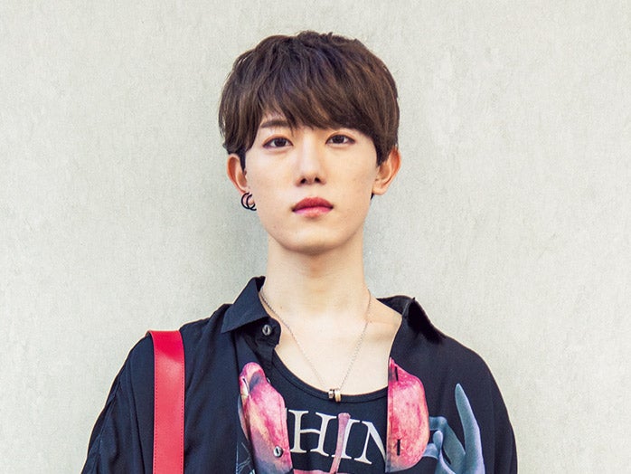 シャリーフの変形シャツとグラフィックTを生かしたアーティスティックな装い。色は黒と赤に絞って、ソリッドな表情に。徹底的なスキンケアが生む美肌が、スタイルによりモード感を演出する。