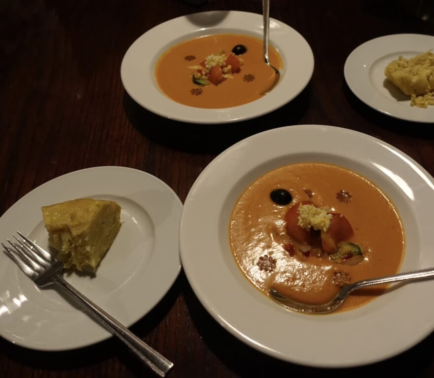 最初にスペインオムレツ、次にガスパチョがきて、メインのパエリヤ、食後にコーヒーと揚げたてのチュロスが出てきます(今は食べてないけど、これがめっちゃ美味しい)。