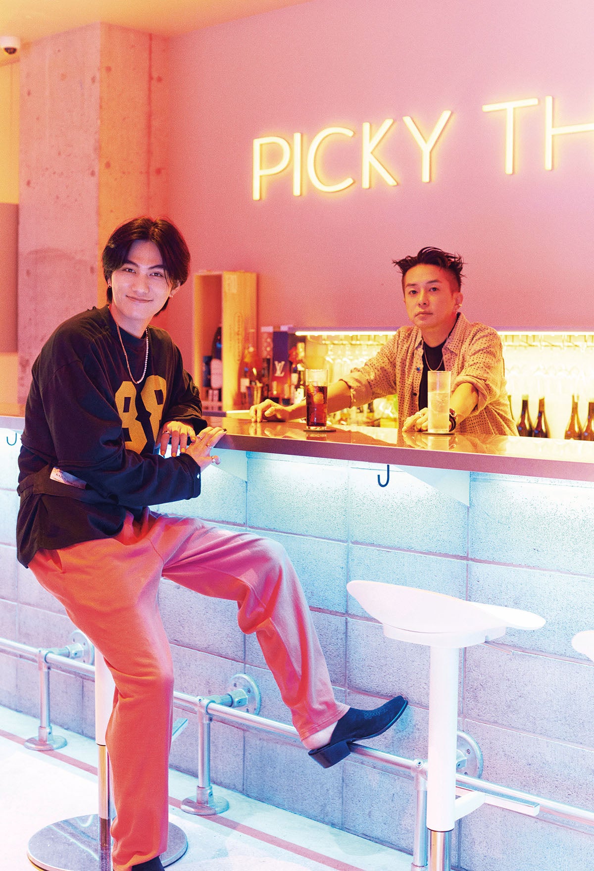 修蔵が長年ヘアをお任せしているという、ヘア&メイクアップアーティストの奈良裕也氏。奈良氏がディレクションを手がける「PICKY」のオープニングパーティでは、修蔵がDJとしてパフォーマンスしたのだとか。そんな思い入れのある場所へいつものようにおしゃべりに。