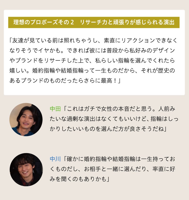 メンズノンノがプロポーズについてのアンケートを実施。多数のプロポーズ成功談の中から、女性フォロワーが選んだトップ3と、女性のリアルな意見が反映された理想のプロポーズ案をメンズノンノモデル中田圭祐、中川大輔、鈴木仁と一緒に見ていこう。これからプロポーズをしようと考えている人にとって、参考にしたいアイディアや大事なポイントが見つかるかも!