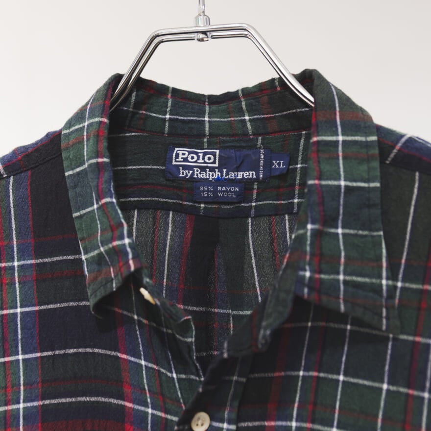 襟元の織りネームには「85% RAYON 15%WOOL」の文字が。ラルフ ローレンらしいグリーン、ネイビー、レッドのチェック柄にも心が躍る。