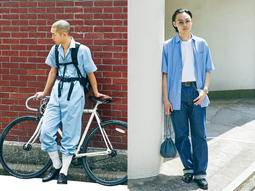 「〝ひとクセ〟ある古着が好きなんです。本来は作業着のはずなのに、半袖+爽やかな水色、の変(?)なツナギ。バックパックのベルトを使って体にフィットさせて、ラフに着てみました」(田中さん)。ベルトの活用やソックスインなど、実用的なテクニックがこなれ感満載。