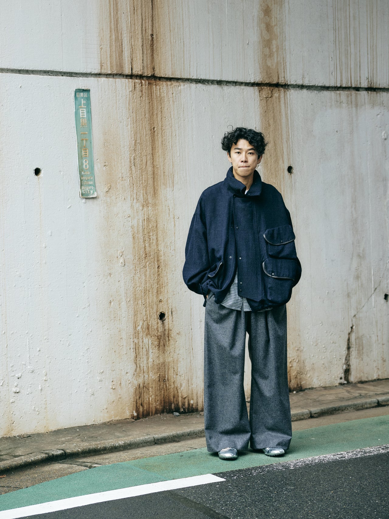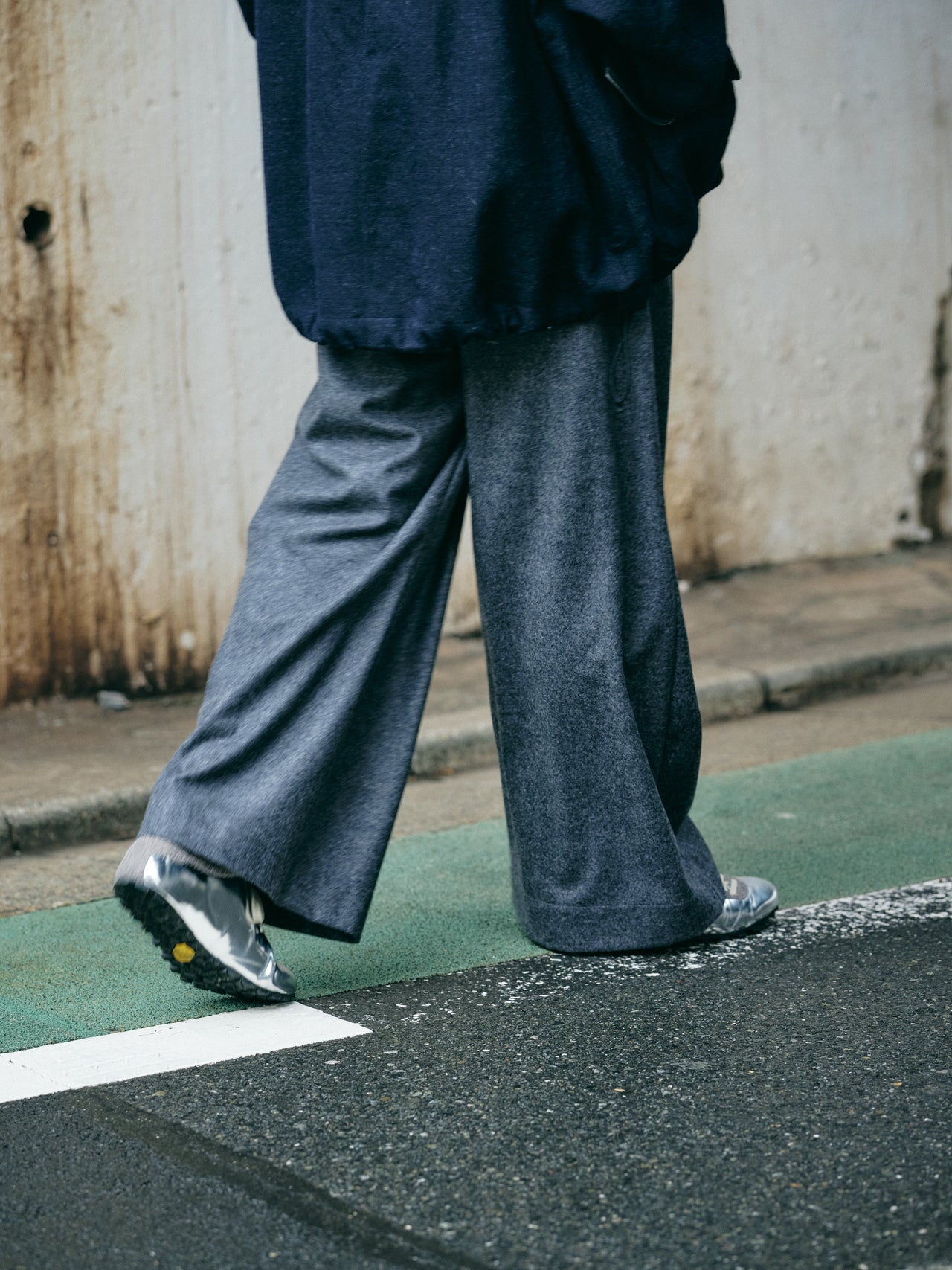 【コワザ】足元はシルバーとグレーで色合わせ。トップスが大きめのシルエットを、野暮ったくならないよう足元で締めるイメージで。