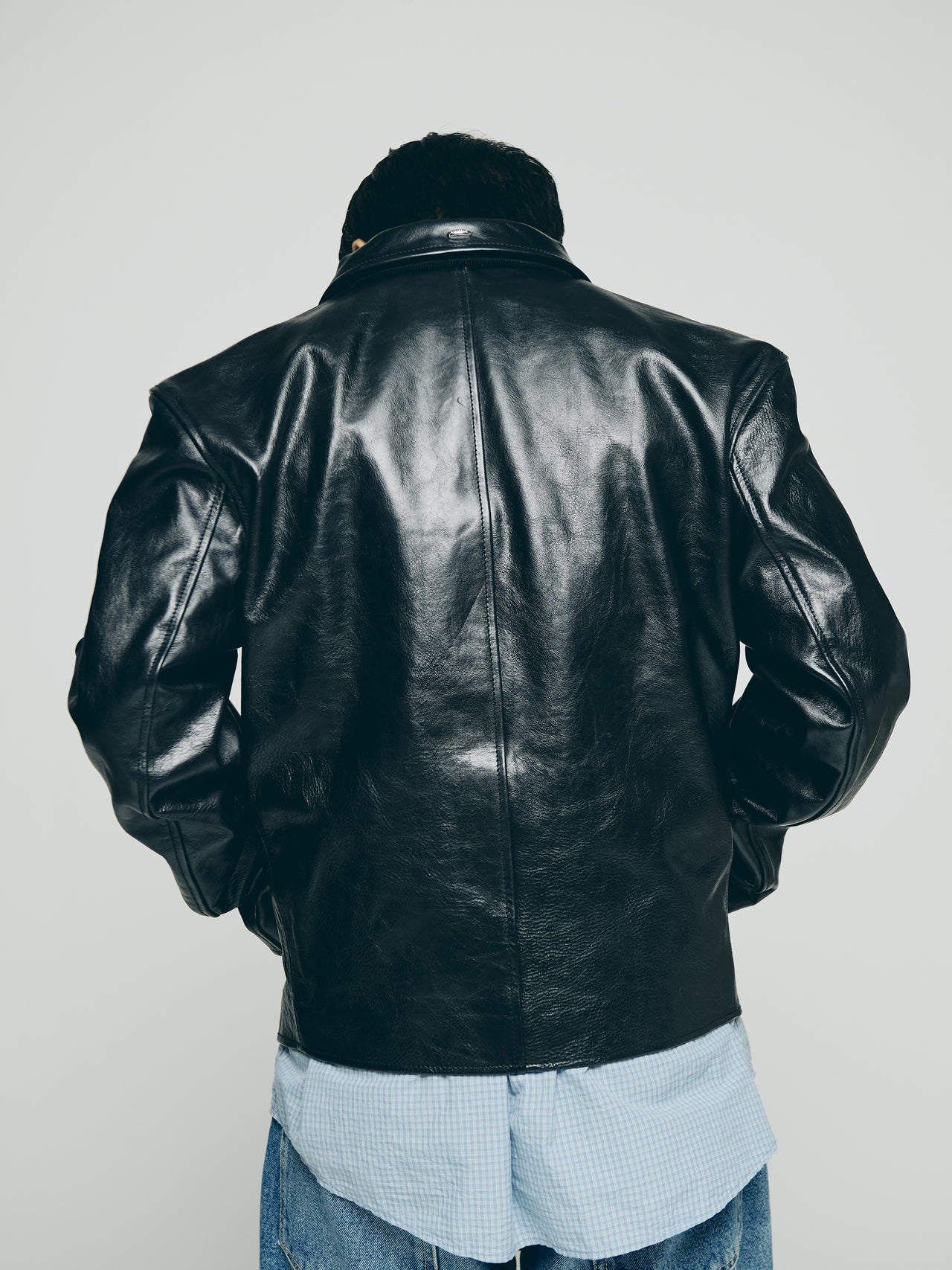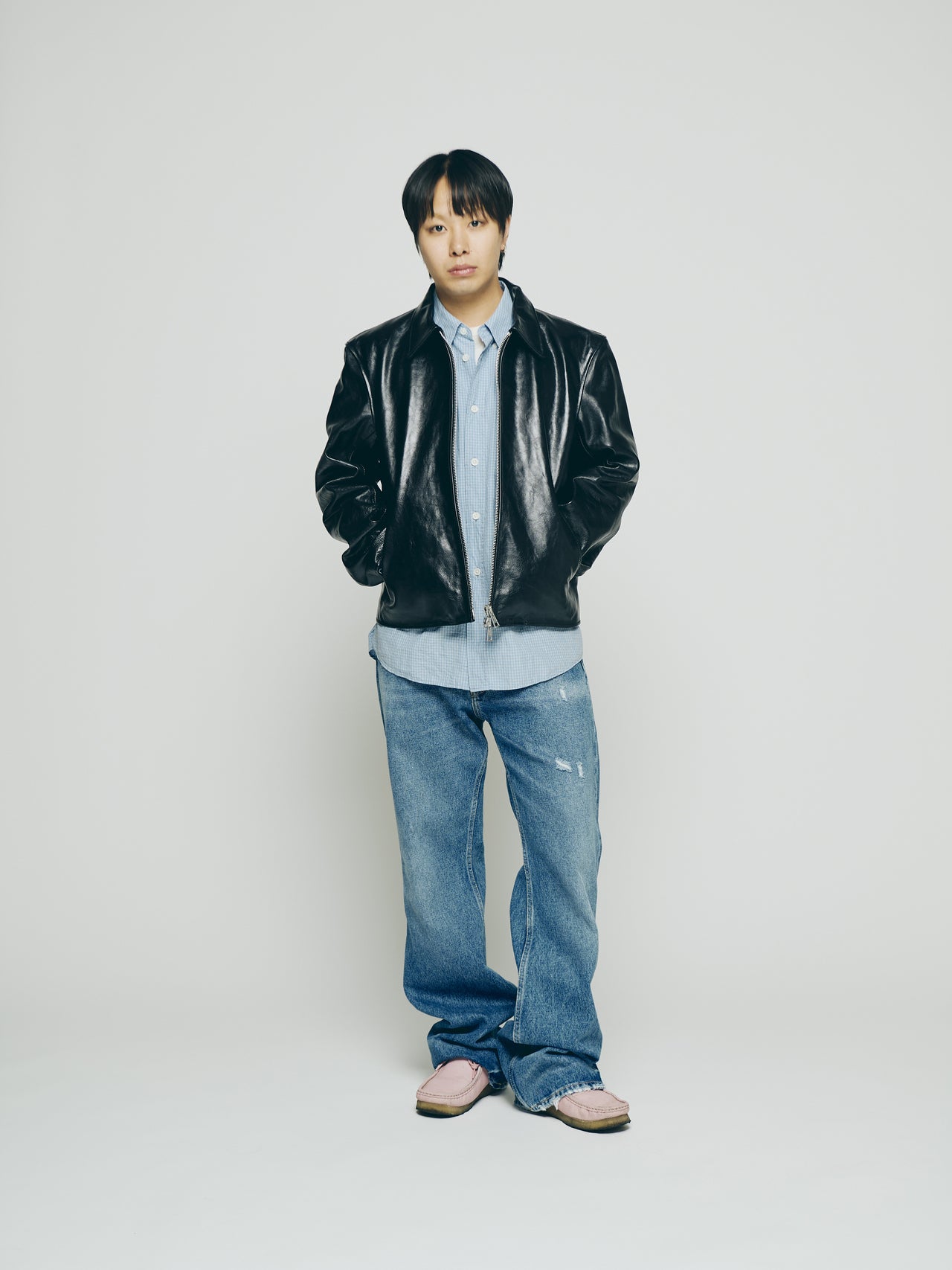 「シンプルな真っ黒レザーは存在感があるけれど、無骨すぎる印象は出したくなかったので、ブルーのギンガムチェックシャツとピンクのワラビーを合わせて、自分らしい雰囲気をプラス。レザーの存在感とギンガムチェックの柔らかさのバランスが気に入っています」。