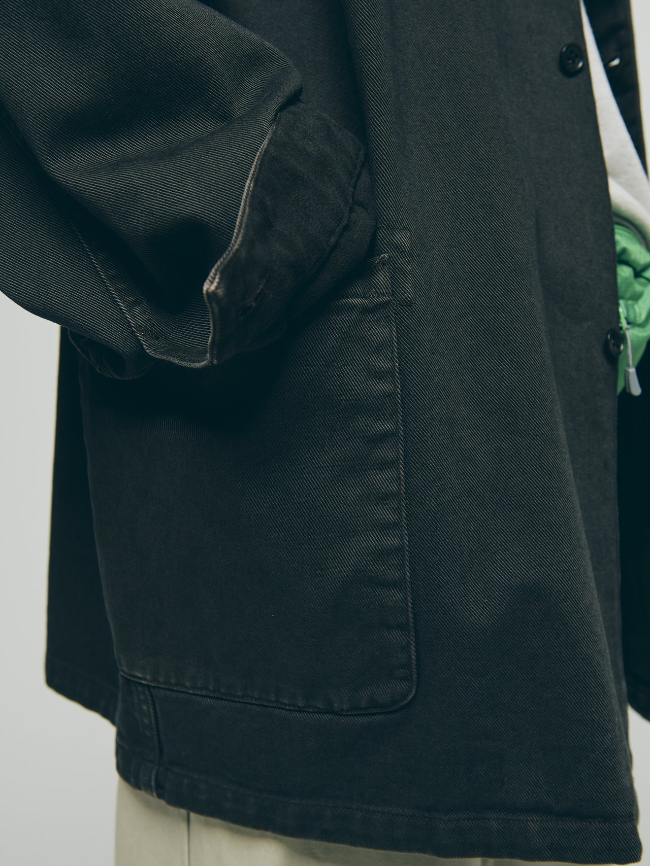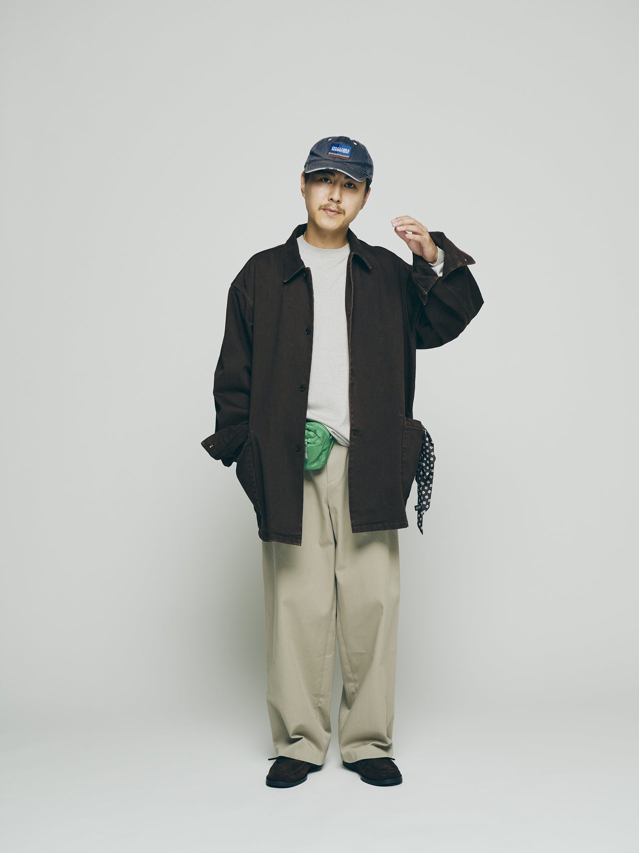 「厚手のツイル生地をベースに、裏面が微起毛のオリジナルファブリックを使用。製品染めによる独特な色合いと風合いは唯一無二。一重仕立てで着心地も柔らかい」。