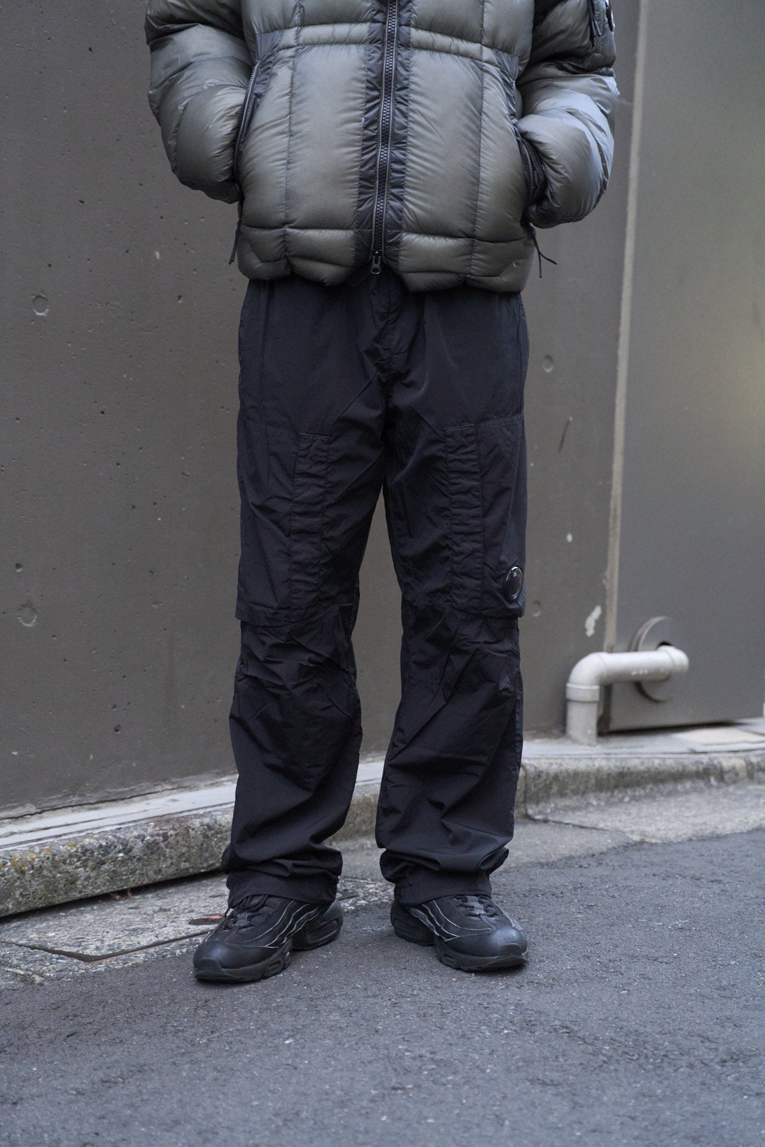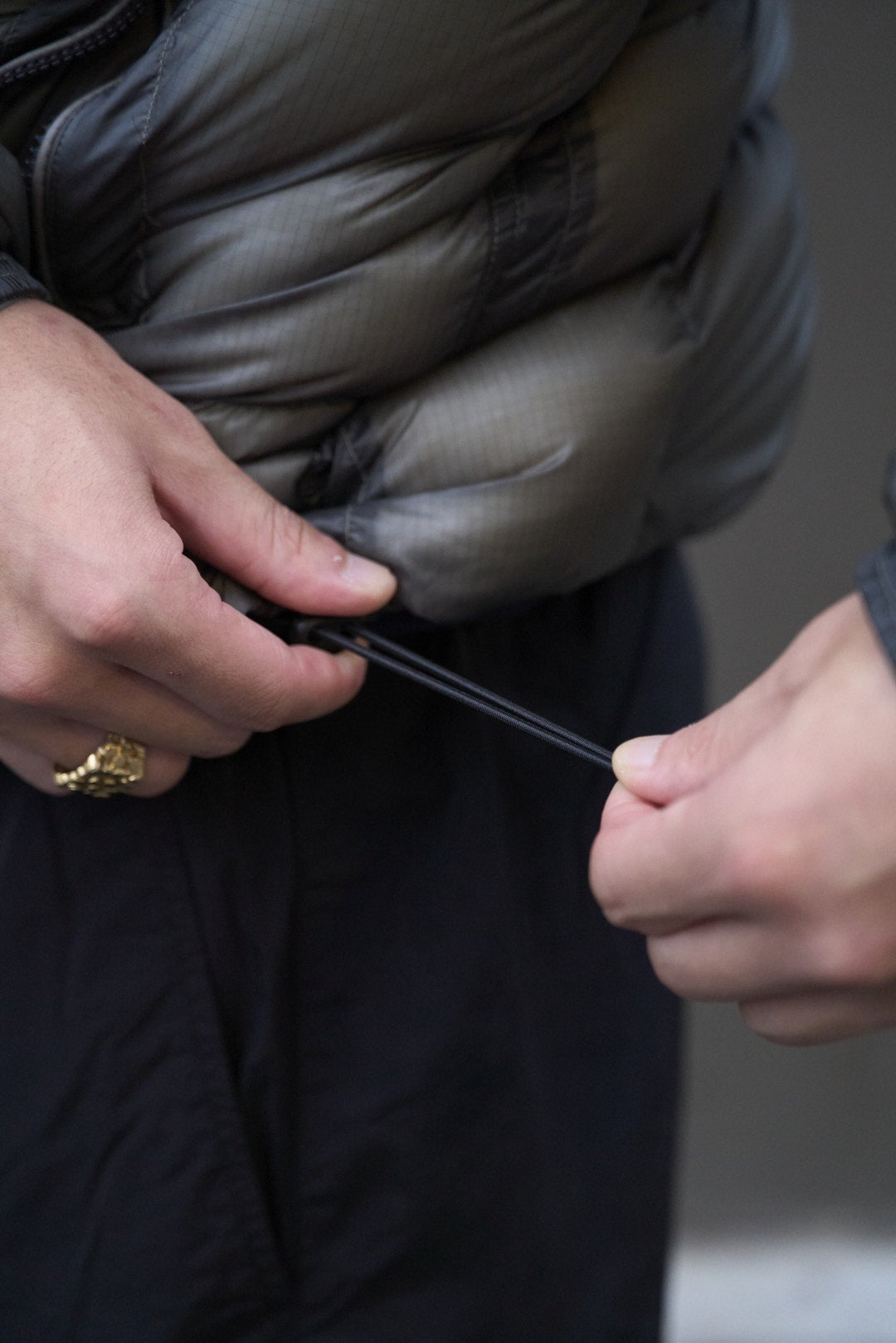 「ゴーグルフードではなく、袖にレンズを搭載したシンプルなロゴデザインになっているのがポイント。その特徴を活かしてコーディネートもシンプルにモノトーンコーデにしました。羽毛がうっすらと透けて見える極薄ナイロンは、コーディネートの抜け感にぴったりです」。