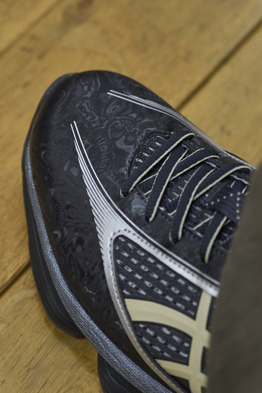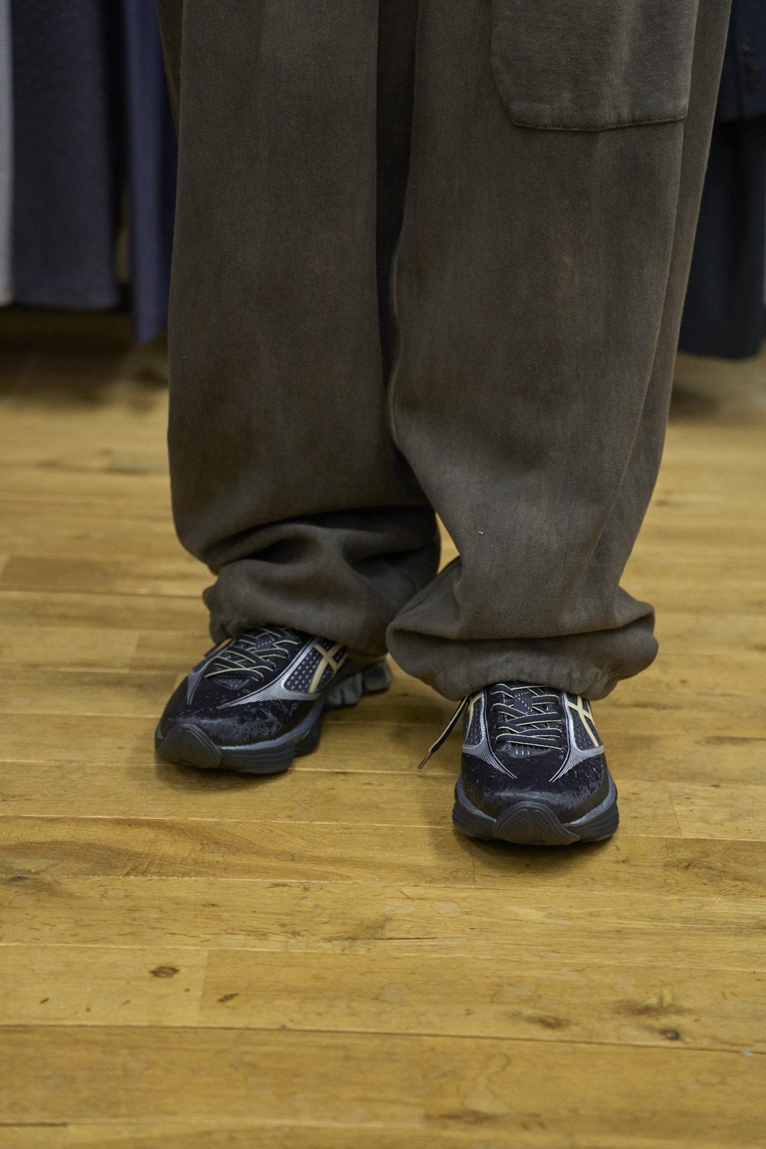 「足もとはKiko Kostadinov StudioとASICS SportStyleの共同監修による1足をチョイス。サッカースパイク”STREAL 361”と”洞窟”がテーマでシュッとしたシルエットが魅力。アッパーの模様はコーディネートのアクセントにもなります」。