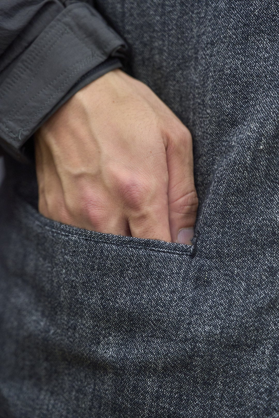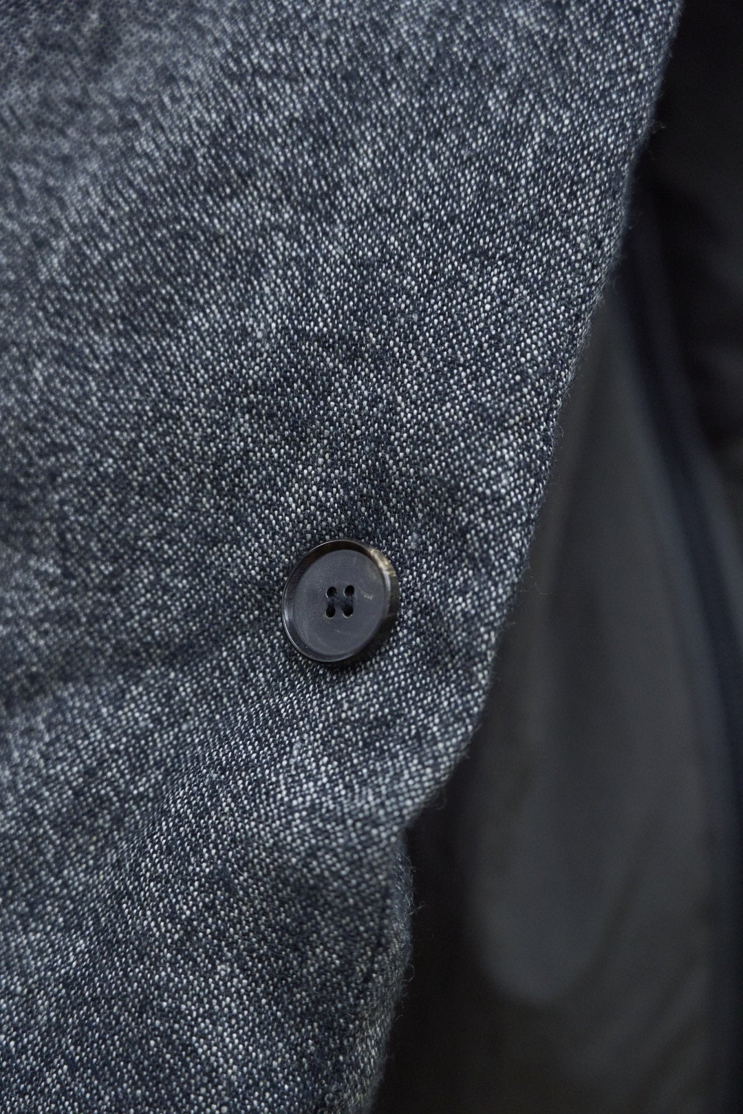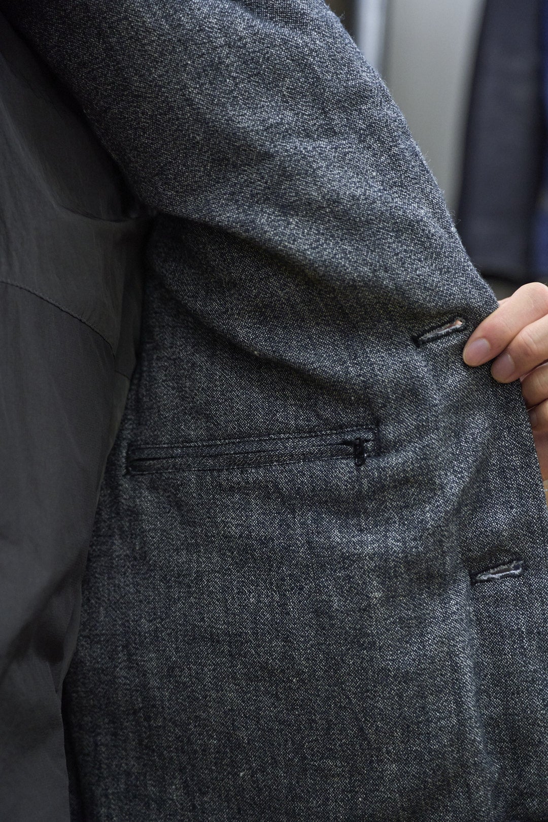 「ウールとリネンを組み合わせたオリジナル素材は、着込むほどにネップ感が増し、愛着のわく表情に。グレーとブラウンの組み合わせも、テーラードカラーのデザインがシンプルな装いを引き立てます」。