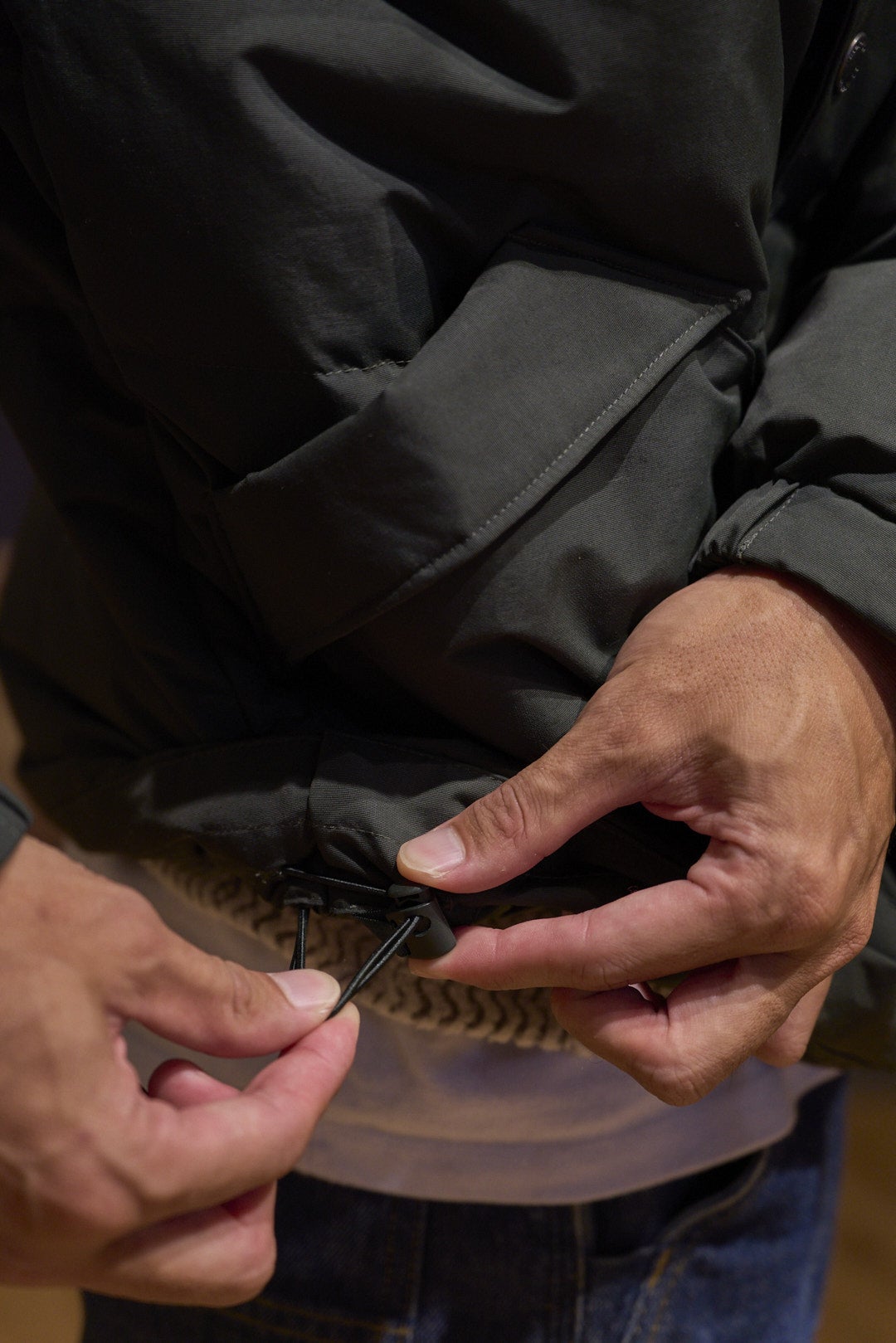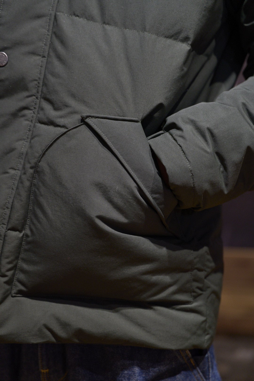 「ダウンのクラシックなデザインを目立たせたかったので、ハンマーループつきのジーンズと合わせたシンプルなコーディネートにしました。600フィルパワーのリサイクルダウン100%を使用。保温性が高いので、中はTシャツでも十分暖かいです」。