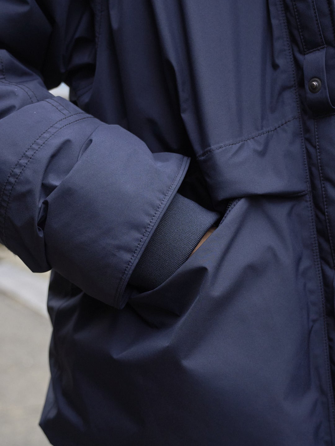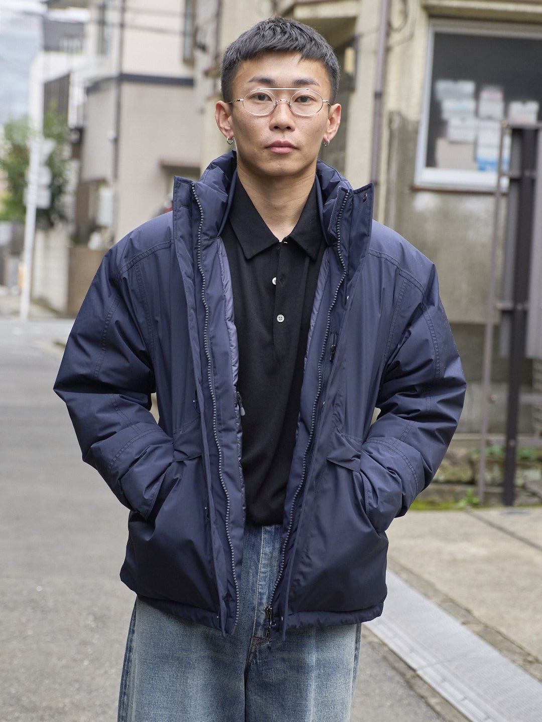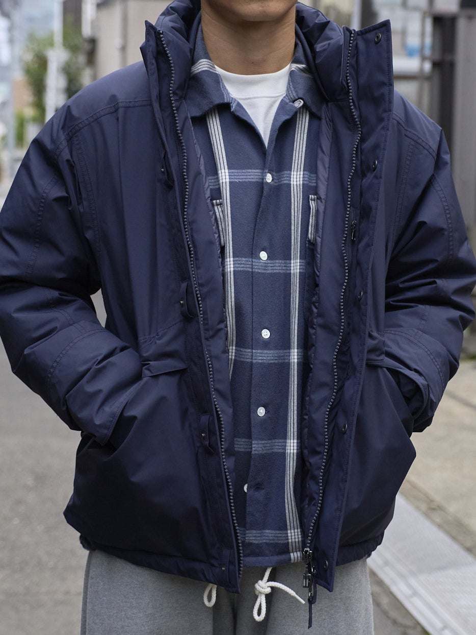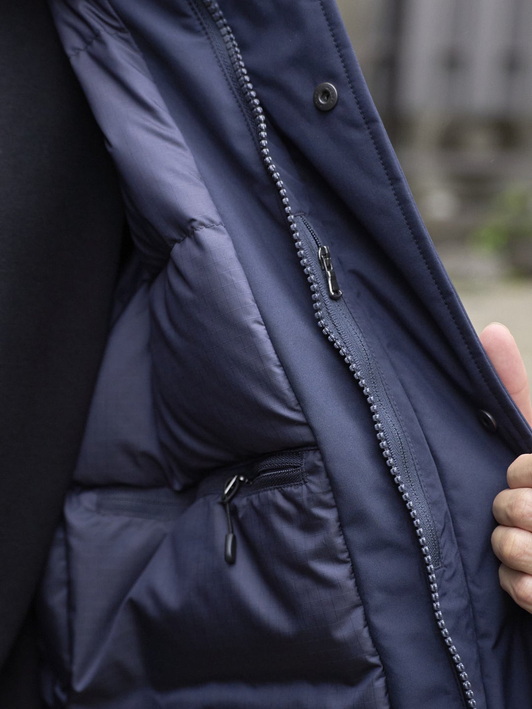 「ゴアテックス ファブリクスと光電子®ダウンを採用したハイブリッドダウン。雨にも雪にも強い素材ですし、体温に近い自然な暖かさを得られるのがポイントで、中は薄手のトップスでも十分暖かいです。襟もとのボタンを大きめに開けることにより、全体的にリラックス感のある雰囲気を目指しました」。