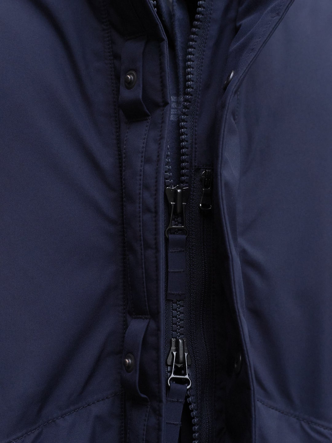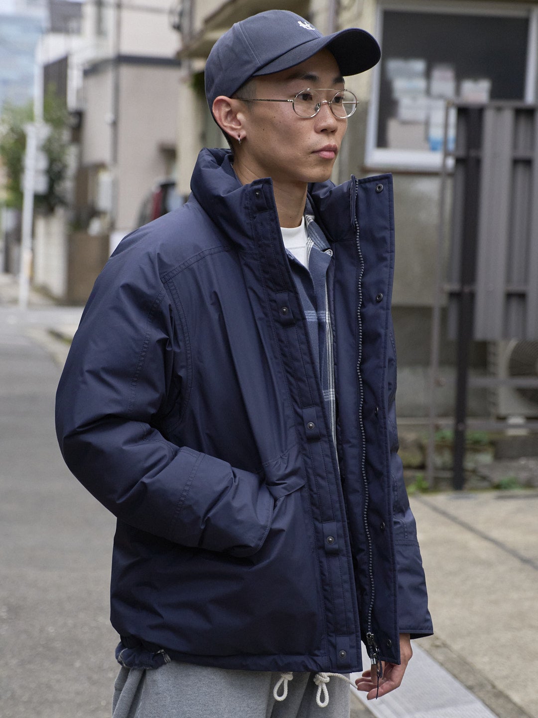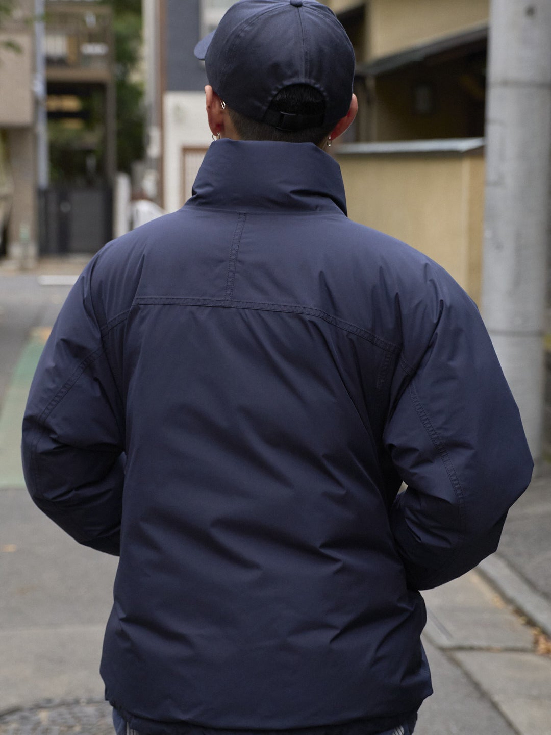 「ゴアテックス ファブリクスと光電子®ダウンを採用したハイブリッドダウン。雨にも雪にも強い素材ですし、体温に近い自然な暖かさを得られるのがポイントで、中は薄手のトップスでも十分暖かいです。襟もとのボタンを大きめに開けることにより、全体的にリラックス感のある雰囲気を目指しました」。